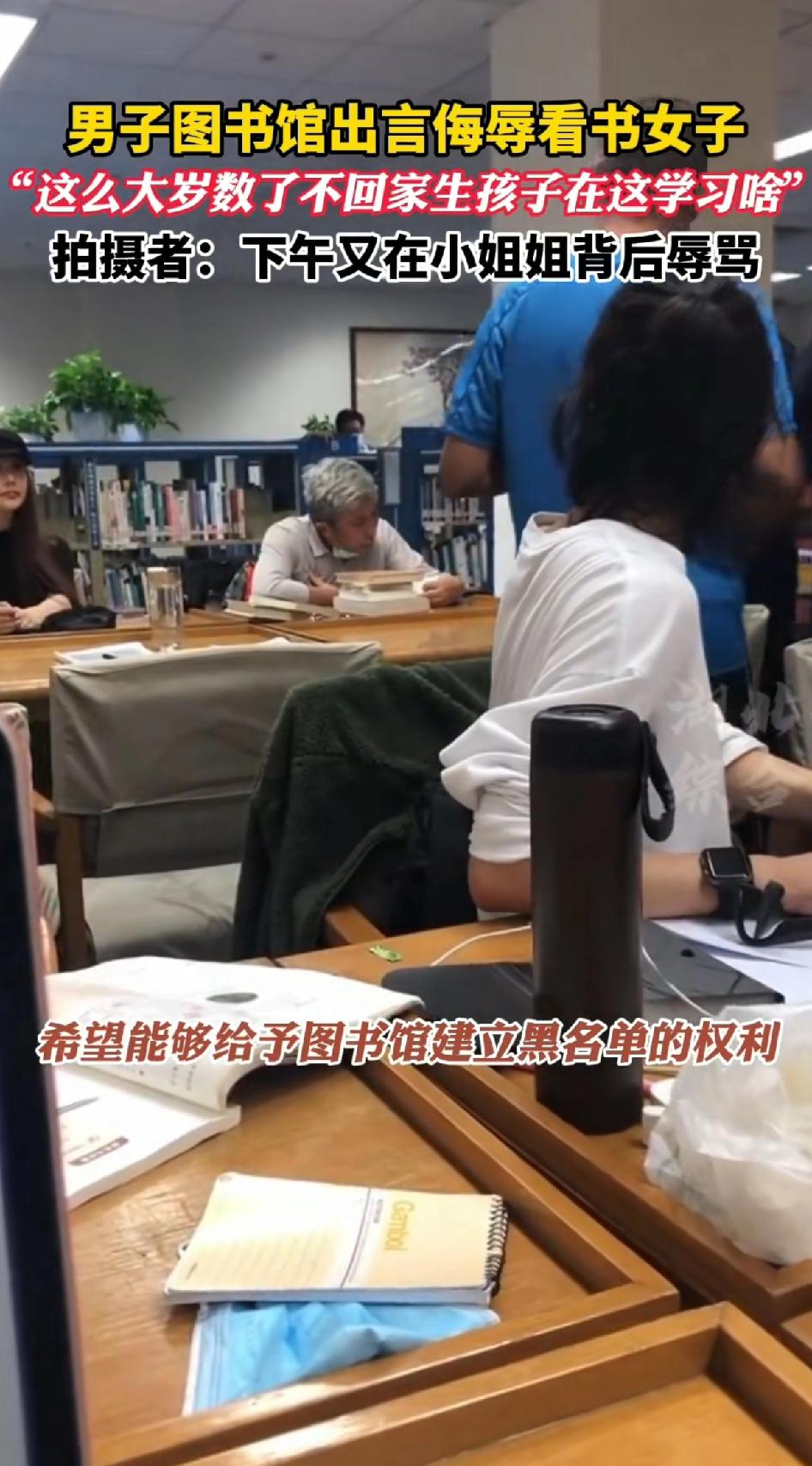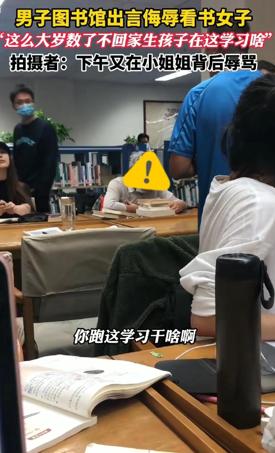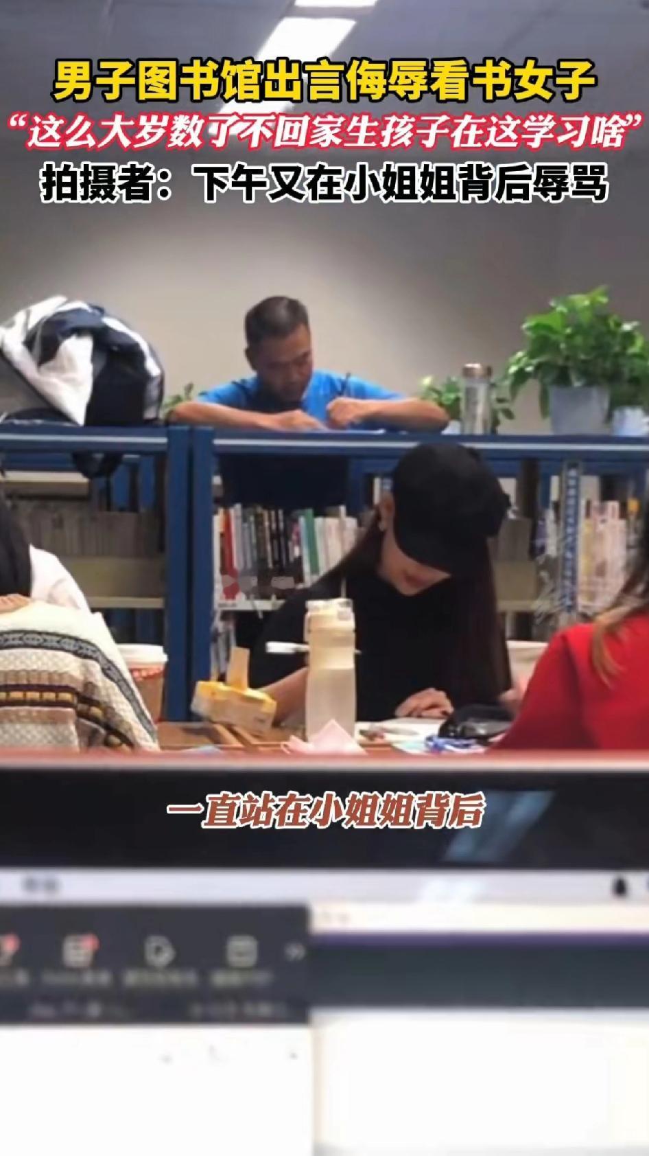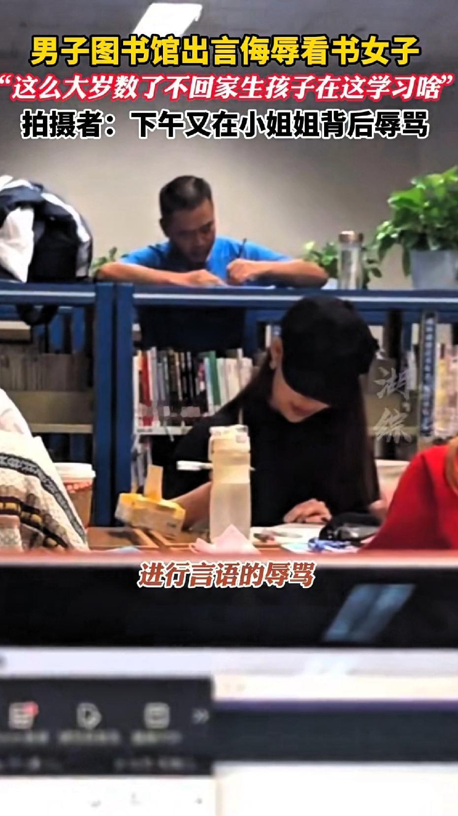 男子图书馆出言侮辱看书的女子 “这么大年纪不回家生孩子在这里学习啥” 据拍摄者说一名在图书馆看书的小姐姐,莫名的受到陌生男子的“语言侮辱” 对方称自己是“复旦大学毕业”的,并质问小姐姐这么大年纪不回家生孩在这学习啥? 小姐姐表示自己并不认识对方,最后图书管理员将该男子赶出图书馆。 本以为这件事就算结束了,没想到下午男子又进入图书馆,一直站在小姐姐后面又进行“言语辱骂” 在场的人感到很无语,本来进图书馆来学习知识的,谁知道碰到这样莫名其妙的男子,莫名其妙的攻击女性。 现在的教育体系早就鼓励女性学习知识,做独立女性。 没想到男子男子竟然用“学习知识”来攻击女性。 “变态”的心理认为女性不该学习,就该在家生孩子。 女子也是很气愤本来就是看书学习的,没想到被人语言攻击! 拍摄者称希望图书馆建立黑名单权利,支持图书馆有这样的权利,不能让心理变态进入图书馆。
