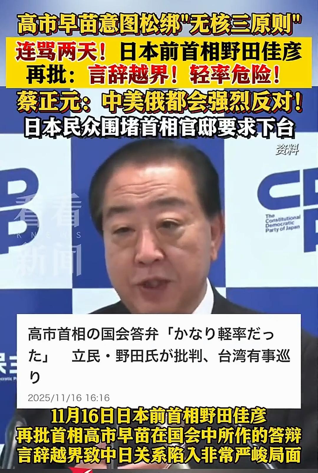 突发!日本外务省高官今日访华,我们会给台阶吗? 今天,日本又有新动静了,也许这是意料当中的。据日本广播协会(NHK)报道,日本外务省亚洲大洋洲局局长金井正彰今天(11月17日)要来中国访问,还打算跟外交部亚洲司司长刘劲松等人展开会谈,日本从嘴硬到说软话,从连续对抗到赴京说明,这是反转反转再反转呀。 这趟访华的目的很明显,就是来给日本首相高市早苗“擦屁股”的。高市早苗之前在国会大放厥词,宣称“台湾有事”可能构成日本可行使集体自卫权的“存亡危机事态”,这不是明摆着干涉咱中国内政、触碰中国底线吗?消息一传出,激起千层浪,中国这边反应强烈,外交部副部长孙卫东火速召见日本驻华大使提出严正交涉,发言人也三连问,把日本的错误行径批得明明白白,我们从军事、外交、法理连续打出组合拳日本一定是亚历山大呀! 在国际上,高市早苗也没少遭批评。日本国内多位前首相、学者、媒体都站出来指责她,说她这言论太轻率,会把日本拖入危险境地,还违背了日本长期奉行的一个中国原则。国际网友也纷纷吐槽,说她这是想把世界推向战争。而且,俄罗斯针对北方四岛发出强硬言论,韩国针对独岛加强实际控制,朝鲜学者开会猛批日本,搞事的高市陷入了四面楚歌的境地。 如今,日本外务省高官来解释,说白了就是日本坐不住了。一方面,中国的强硬态度和国际社会的批评让他们压力山大;另一方面,他们也清楚,跟中国把关系闹僵了,对他们没好处。无论是经济上,还是国际形象上,以及琉球独立,那一个都是日本承受不起的代价。就像之前日本外相岩屋毅访华,又是商讨取消水产品禁令,又是放宽签证政策,就是想改善关系,减少损失。 但问题来了,日本现在来解释,我们就该给台阶下吗?从中国的一贯立场来看,台湾问题是中国核心利益中的核心,是中美关系政治基础中的基础,是中美关系第一条不可跨越的红线,容不得任何妥协和退让。高市早苗的言论可不是小打小闹,已经严重破坏了中日关系的政治基础。如果日本只是嘴上解释,没有实际行动,比如切实约束政客言行、回归一个中国原则,那这“台阶”可不好给。就像前两天″玉洲谭天″所写的文章里说她″被驴踢了″,我看她就是个犟种,如果″驴性″不改,就不能给她面子。 当然,从长远看,中日作为邻国,保持良好关系对双方都有益。可这得建立在日本正视历史、尊重中国主权的基础上。这次日本外务省高官访华,是一个契机,就看日本能不能抓住,用实际行动来证明他们的诚意了。我们可以保持对话,但也绝不能放松警惕,必须让日本明白,触碰中国底线的后果很严重!