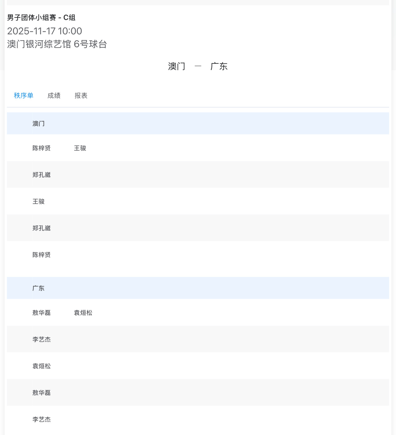 第十五届全运会乒乓球男子团体小组赛 - C组2025-11-17 10:00 6号球台【澳门vs广东】陈梓贤王骏vs敖华磊袁烜松郑孔崴vs李艺杰王骏vs袁烜松郑孔崴vs敖华磊陈梓贤vs李艺杰