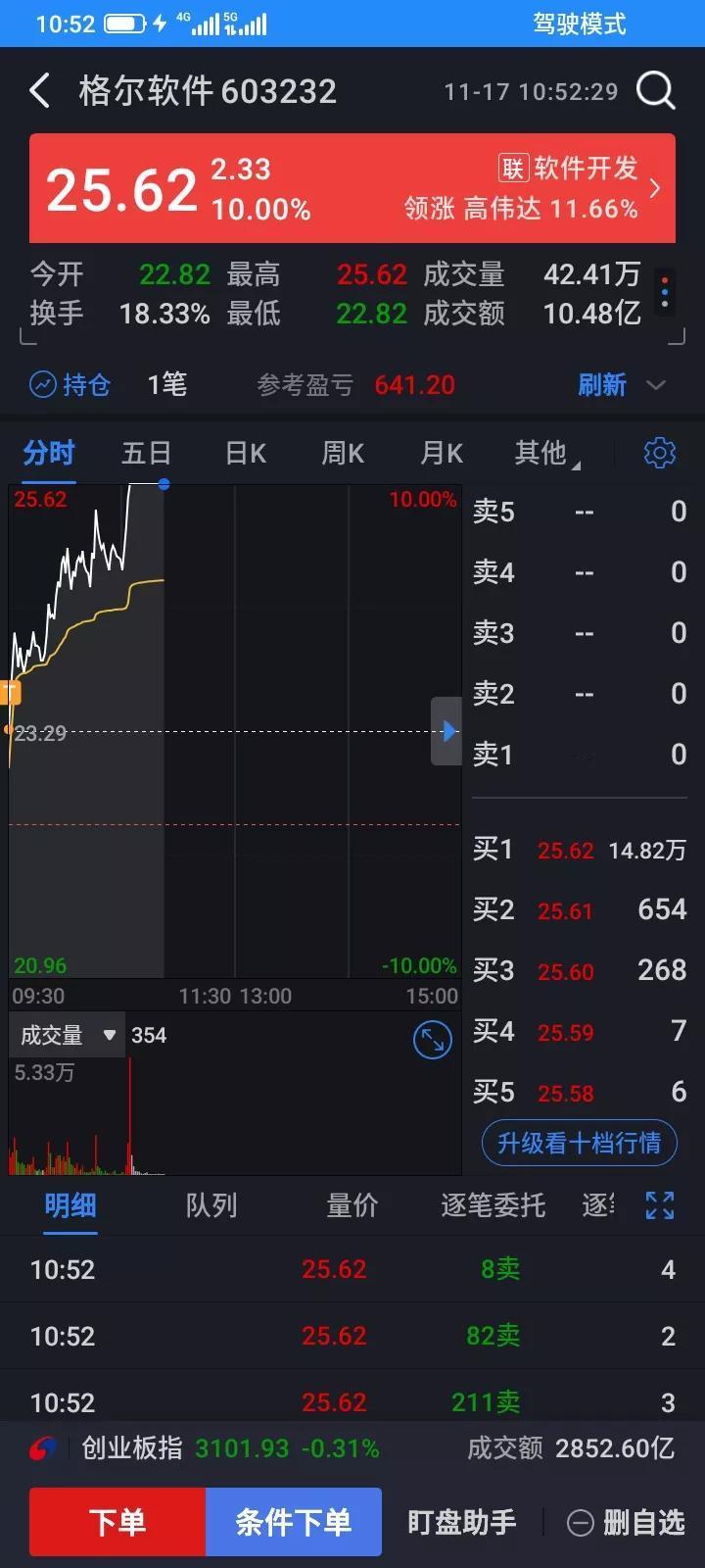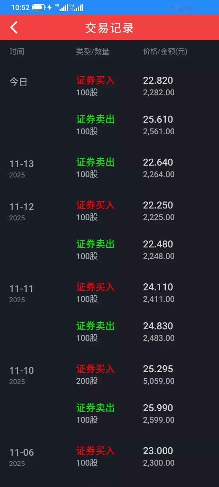 2025.11.17,今天又蒙对一次,早上集合竞价以22.82买入100股格尔,怕封不住涨停板,于是委托以比涨停价低一分钱,25.61卖出100股,很快成交了,涨停了,少赚了一块钱,也无所谓了,做t成功,赚279元,进一步降低了持股成本,降低风险,今后再跌下来亏掉的也只是利润,下跌也没有那么恐慌了。