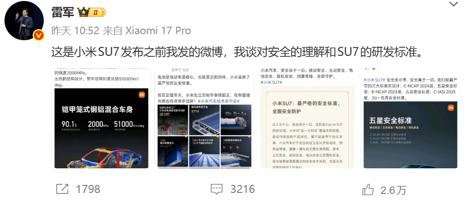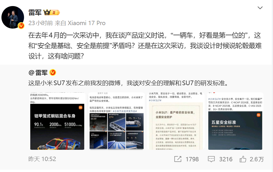 雷军坐不住了,昨天一连三条微博,直面“小米汽车好看比安全重要”的舆论风波。事件的起因是,近期有网友断章取义,称“小米汽车好看比安全重要”。对此,雷军明确回应:“安全是基础、安全是前提”、“安全高于一切”。雷军在辟谣中毫不留情地指出:“网上有不少人断章取义,歪曲抹黑。”一位网友在评论区的留言点出了关键:“可惜很多人断章取义啊,说小米汽车好看比安全重要。”