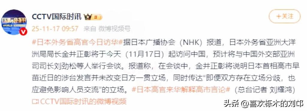 刚遭中方多部门接连警告 日本便迅速派高官来华“灭火”? 11月17日,日本外务省金井正彰径直前往中国进行会谈,嘴上声称要解释高市早苗涉台言论,称“未改变一贯立场”,实则心里全是现实考量。 此前,高市早苗在国会公然暗示要武力介入台海,将中方底线践踏得清清楚楚,换来的是外交部的严正交涉、军报直白警告“日本或成战场”。如今派高官上门解释,说白了就是怕真把关系弄僵,自己承受不了后果。 日本所谓的“一贯立场”根本经不起推敲,一边宣称遵守一个中国原则,一边偷偷将数十个机场港口改为军民两用,还跟随美国开展联合军演。此次妄图靠一句“没改变立场”蒙混过关,顺便保住人员交流的好处,这算盘未免打得太精。 中方的态度向来明确,台湾问题是红线中的红线,不是几句外交辞令就能敷衍过去的。金井此次能否“灭火”,关键在于日方是否真的停止挑衅,而非嘴上一套、背后一套。人员交流的前提是相互尊重,踩着别人的核心利益谈合作,根本行不通。 你认为日本此次是真心想缓和关系,还是单纯的缓兵之计?欢迎在评论区分享你的看法~ 日方访华