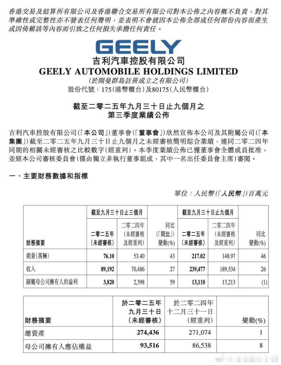 吉利汽车发布 2025 年第三季度财报- 总营收 892 亿元,同比增长 27%;- 归母净利润 39.6%,同比增长 19%;- 汽车销量 76.1 万辆,同比增长 43%;其中新能源销量 44.3 万辆,新能源渗透率 58%;吉利银河品牌 32.7 万辆、中国星燃油车 21.9 万辆、极氪品牌 5.3 万辆、领克品牌 8.7万辆- 1 - 9 月研发总投入 146 亿元,同比增长 8%;