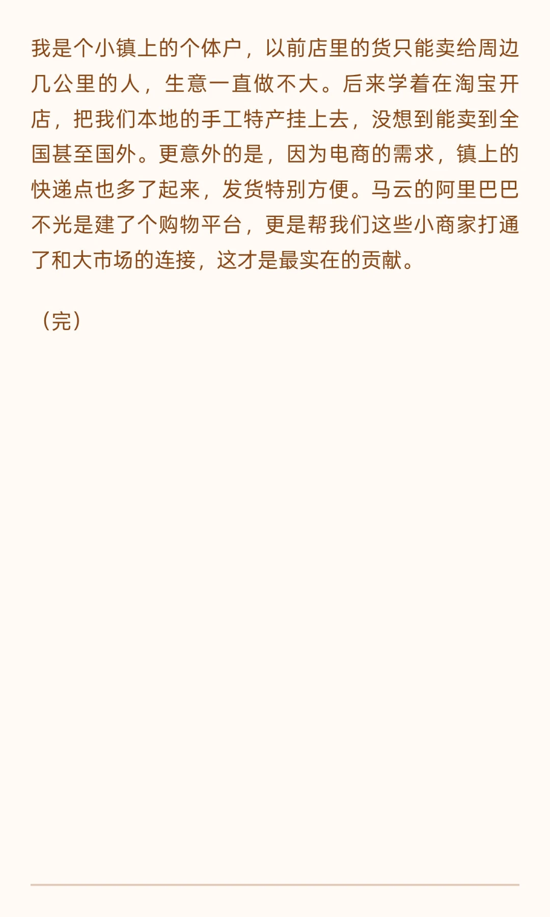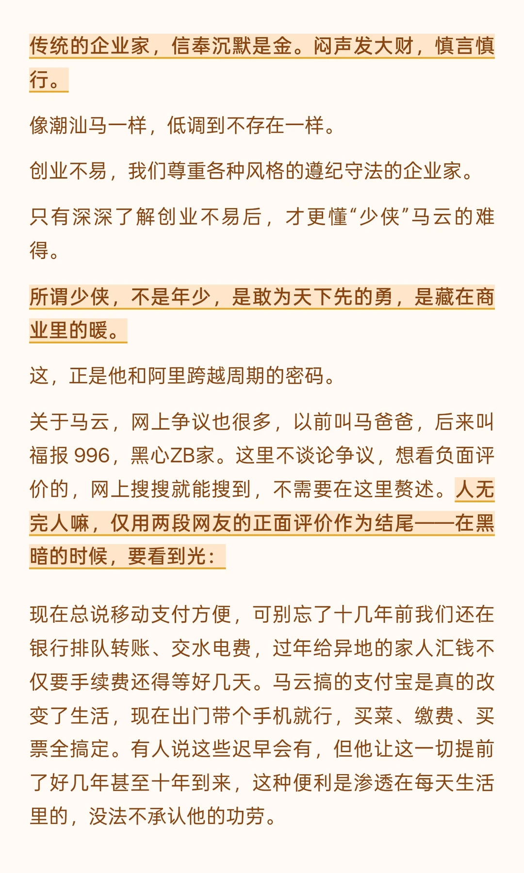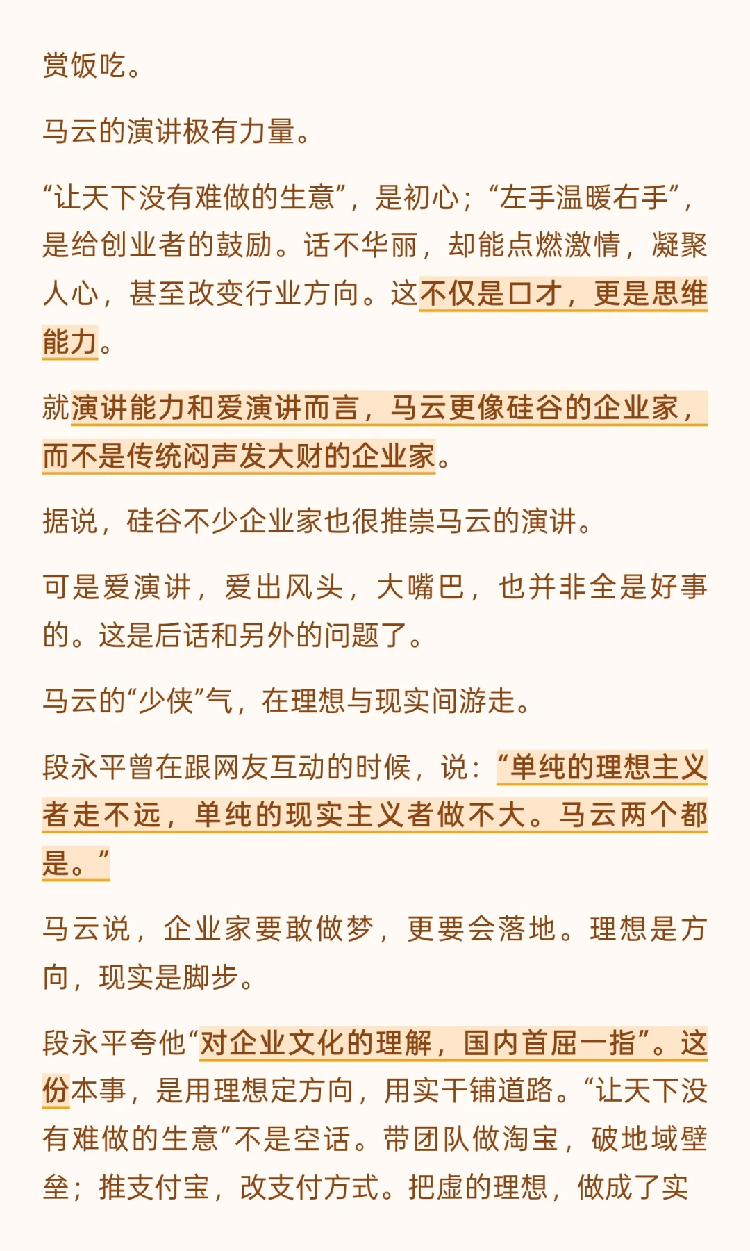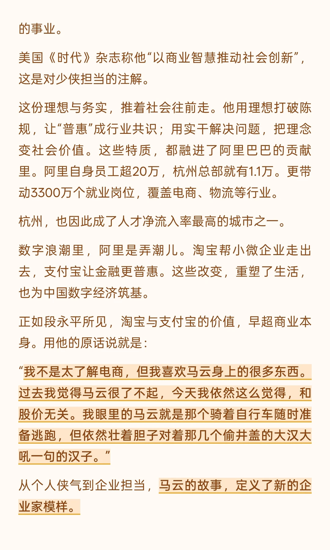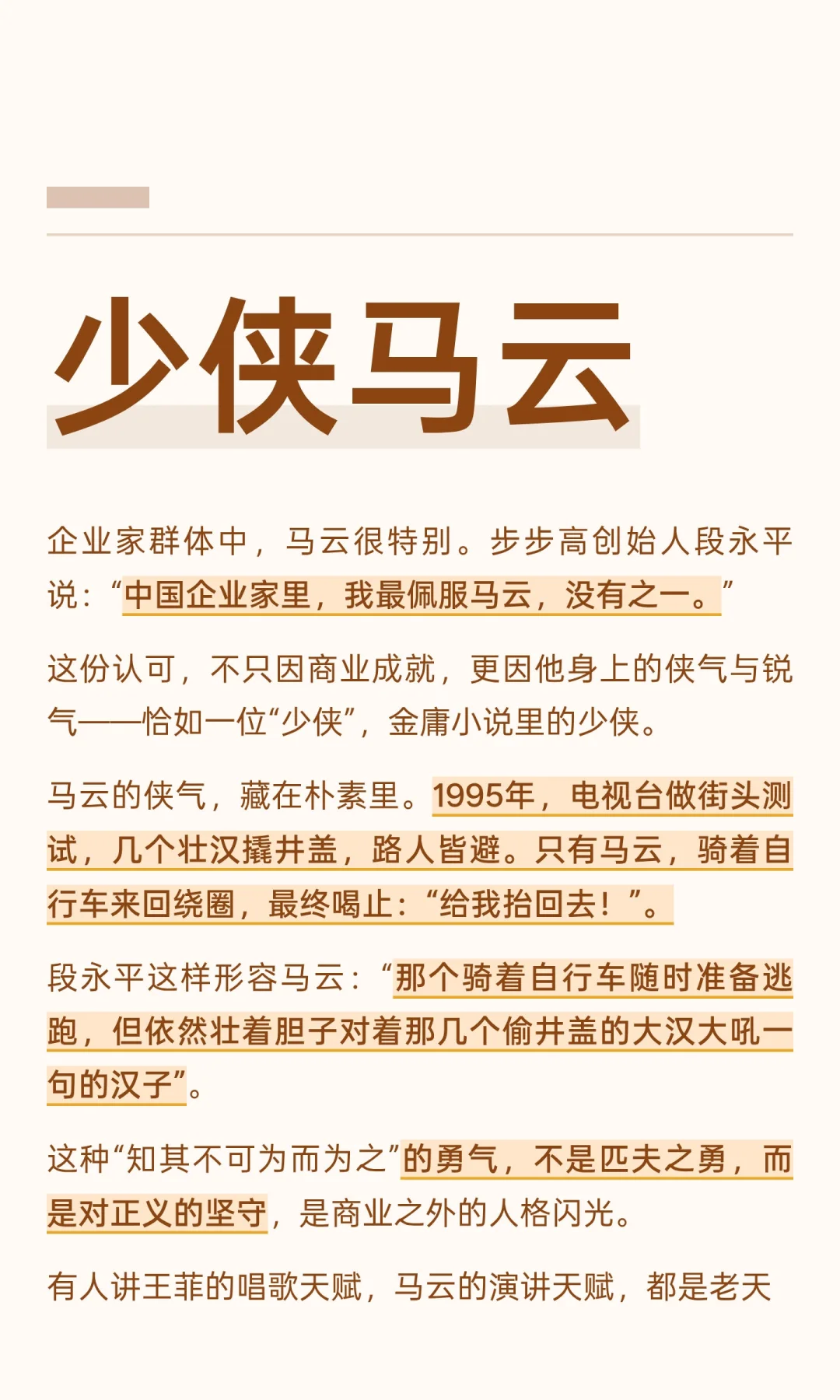 马云以商业智慧推动社会创新,理想与实干并重,推动阿里巴巴成为数字经济基石,创造数百万就业,改变生活。 他的“少侠”气,藏于朴素与担当之中,成为企业家典范。 企业家群体中,马云很特别。步步高创始人段永平说:“中国企业家里,我最佩服马云,没有之一。” 这份认可,不只因商业成就,更因他身上的侠气与锐气——恰如一位“少侠”,金庸小说里的少侠。 马云的侠气,藏在朴素里。1995年,电视台做街头测试,几个壮汉撬井盖,路人皆避。只有马云,骑着自行车来回绕圈,最终喝止:“给我抬回去!”。 段永平这样形容马云:“那个骑着自行车随时准备逃跑,但依然壮着胆子对着那几个偷井盖的大汉大吼一句的汉子”。 这种“知其不可为而为之”的勇气,不是匹夫之勇,而是对正义的坚守,是商业之外的人格闪光。 有人讲王菲的唱歌天赋,马云的演讲天赋,都是老天赏饭吃。 马云的演讲极有力量。 “让天下没有难做的生意”,是初心;“左手温暖右手”,是给创业者的鼓励。话不华丽,却能点燃激情,凝聚人心,甚至改变行业方向。这不仅是口才,更是思维能力。 就演讲能力和爱演讲而言,马云更像硅谷的企业家,而不是传统闷声发大财的企业家。 据说,硅谷不少企业家也很推崇马云的演讲。 马云的“少侠”气,在理想与现实间游走。 段永平曾在跟网友互动的时候,说:“单纯的理想主义者走不远,单纯的现实主义者做不大。马云两个都是。” 马云说,企业家要敢做梦,更要会落地。理想是方向,现实是脚步。 段永平夸他“对企业文化的理解,国内首屈一指”。