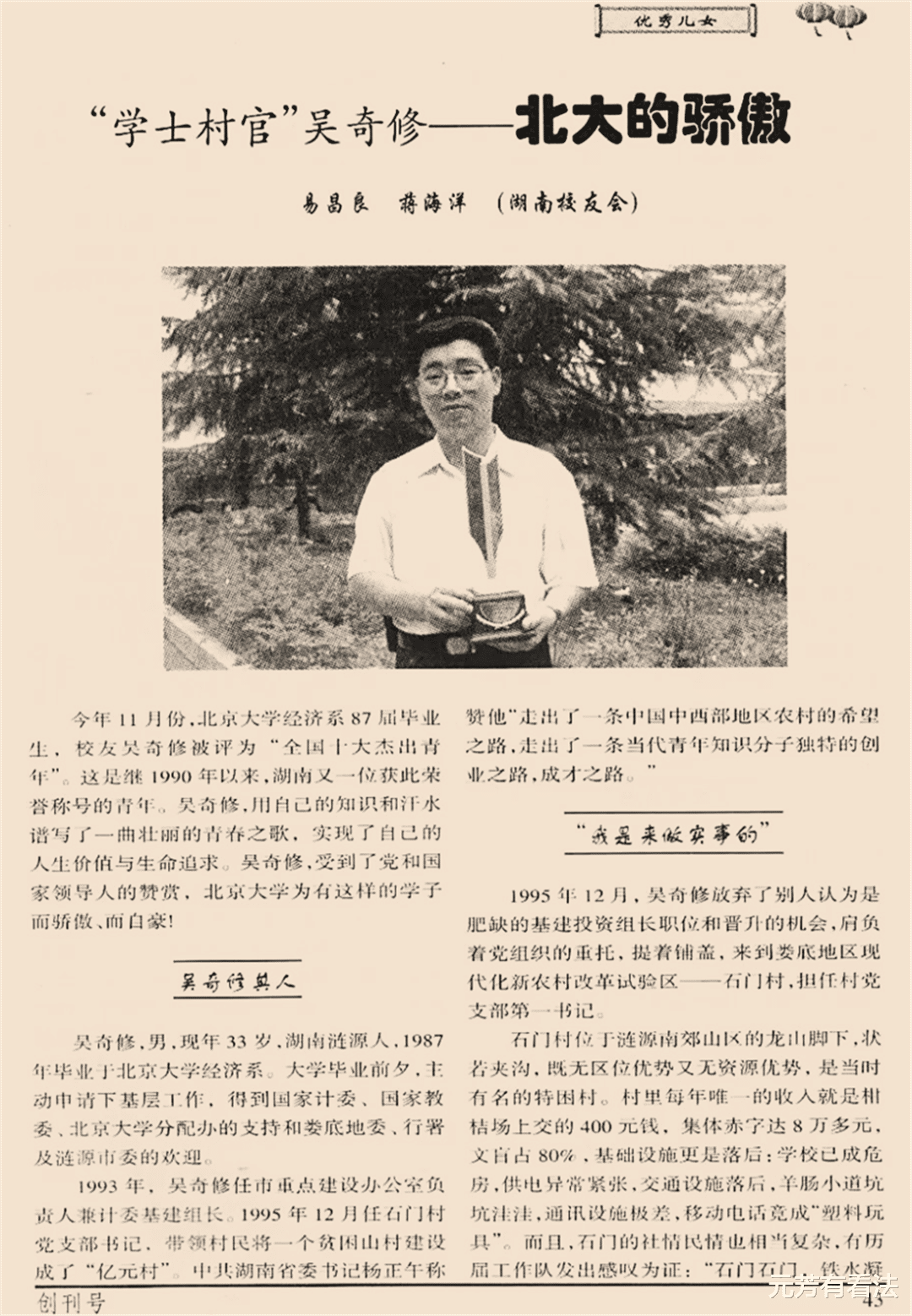 吴奇修身上有很多光环,而且极为耀眼。当年,他是北大史上第一个到基层当村支书的校友,名校身份加持,又在偏远的农村当了近10年村支书,这种身份和履历上的双重结合,给吴奇修后期仕途上的飞黄腾达打下了坚实的基础。