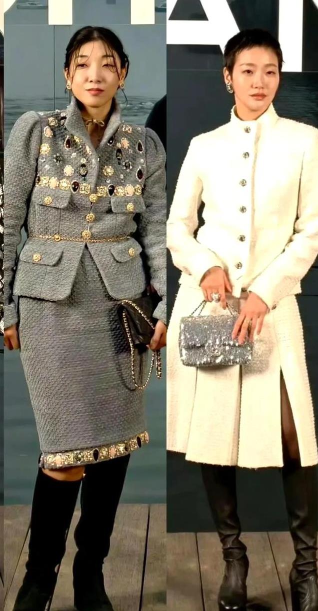 先看周迅,其实没怎么特意打扮,小香风套裙加上黑色的打底裤,头发随意的盘起,这样的造型在她身上看过太多次了,就像是复制粘贴一样,并没有太多的新意。