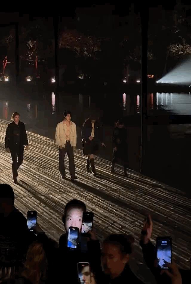这一幕,我直接就想到了胡歌,将一众超模衬得像是保镖一样。