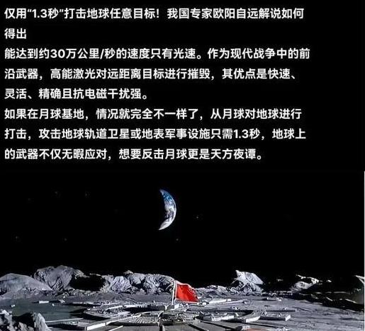 从军事角度来看,月球简直就是太空中的"王者峰顶"。想象一下,在月球上建立一个观测站会是什么样的场景?这就相当于在太空中安装了一个"天眼",24小时不间断地监视着地球上的一举一动。无论是大规模的军事调动,还是导弹发射,都逃不过这只"天眼"的注视。更厉害的是,从月球发起的军事打击只需要1.3秒就能到达地球。这个速度有多快?
