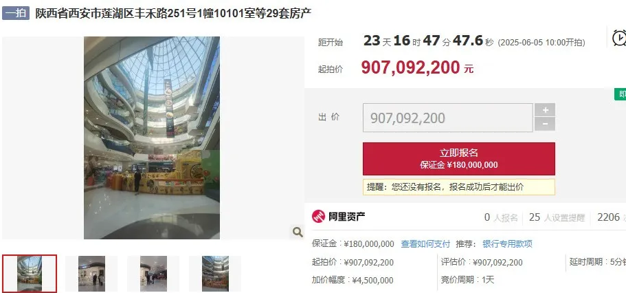 信息显示,西安丰禾万达广场是西安首家被拍卖的万达广场,在2022年9月开业,至今尚不足3年时间。此次拍卖的用途为商业、其他、车库,起拍价90709.22万元。