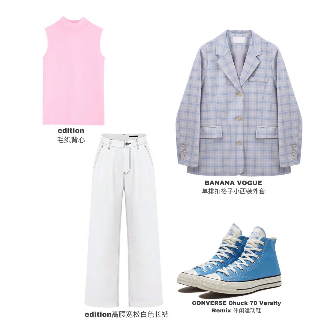 谁说西装就要塑造一个“大女人”,西装裁剪遇上粉蓝格纹生成的是一种有态度的甜美。低饱和度的蓝和樱花粉不会出差错,稍微粘腻了些就用高饱和的蓝中和一下。