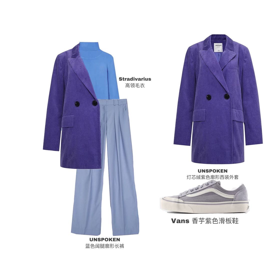 明亮的蓝色与明亮的紫色少见于搭配中,放在一起却是相宜的。我想要的不只是亮色与亮色的交锋,还有同色系高饱和度和低饱和度呈现的“淡妆浓抹总相宜”,它们放在一起不只好看,而是色块的奇妙组合。