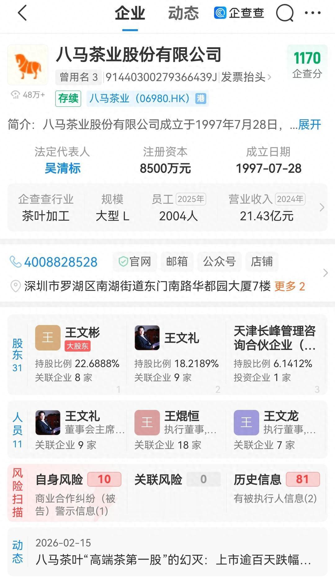 此前八马茶业曾五次递表。2013年,八马茶业首次冲击深交所中小板失败,后于2015年11月在新三板挂牌,2018年4月摘牌;2021年4月申报深交所创业板,2022年5月撤回;同年8月转申报主板,2023年9月正式撤回;2025年1月首次向港交所递表,8月28日再递表。招股书显示,八马茶业的控股股东及实际控制人为创始人王氏家族成员——王文礼、王文彬、陈雅静、吴小宁、王小萍、王文超。其中,王文礼、王文彬、王文超为三兄弟,王小萍为王文彬、王文礼之妹及王文超之姐,陈雅静为王文彬的配偶,吴小宁为王文礼的配偶。另外,王文超前妻蒋妮娜亦持股2.51%。茶之外,王文彬夫妇的子女,通过联姻与安踏、七匹狼以及高力控股紧密相连。