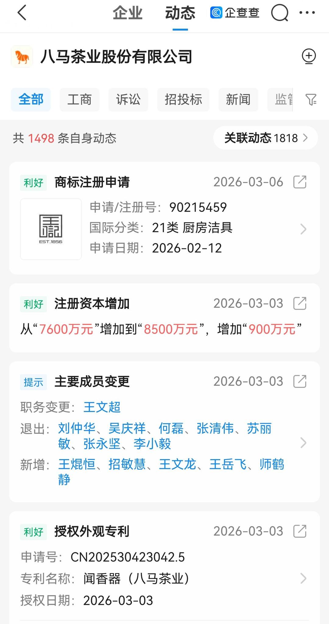 企查查显示,近日,八马茶业对董事会及监事会成员进行了调整。职务变更方面,王文超由董事变更为董事、副总经理。多名此前在公司任职多年的核心成员退出。其中,刘仲华、吴庆祥、何磊、张清伟退出前职务为董事,苏丽敏、张永坚、李小毅退出前职务为监事。与此同时,公司新增王焜恒、招敏慧、王文龙、王岳飞为董事,新增师鹤静为财务负责人。