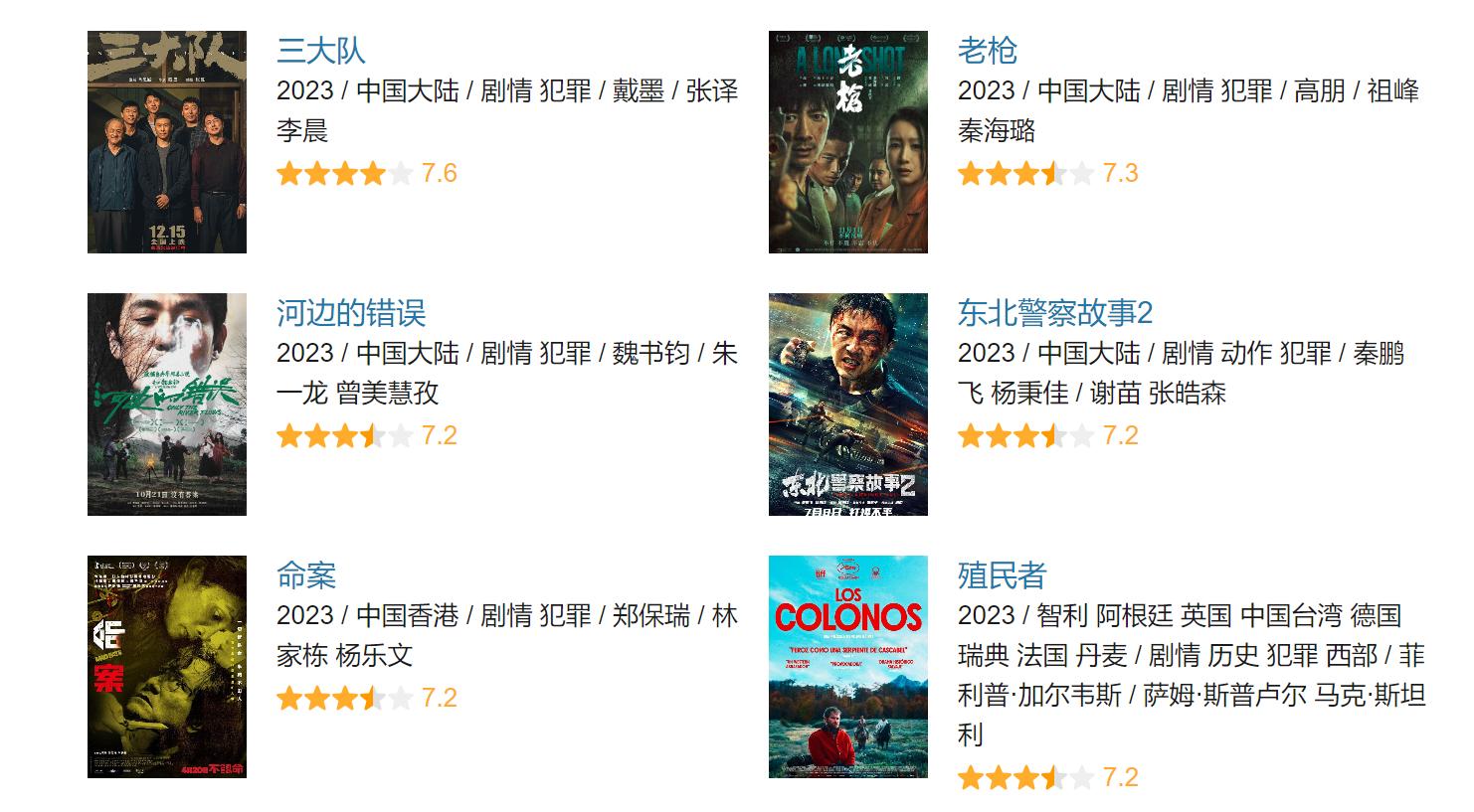 就拿近5年来说,只有2023年的内地犯罪电影大爆发了一次,输出了《三大队》《老枪》《河边的错误》《东北警察故事2》这样相对高分的犯罪电影,其他年份,找一部上7分的内地犯罪电影都难。