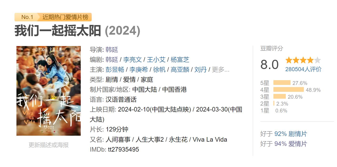 这位自2015年就被多次提名为“最佳导演”的电影人,一直擅长讲真挚动人,浪漫治愈的故事,毕竟去年的《我们一起摇太阳》,已经在豆瓣冲到了8分,导演水平很高了。