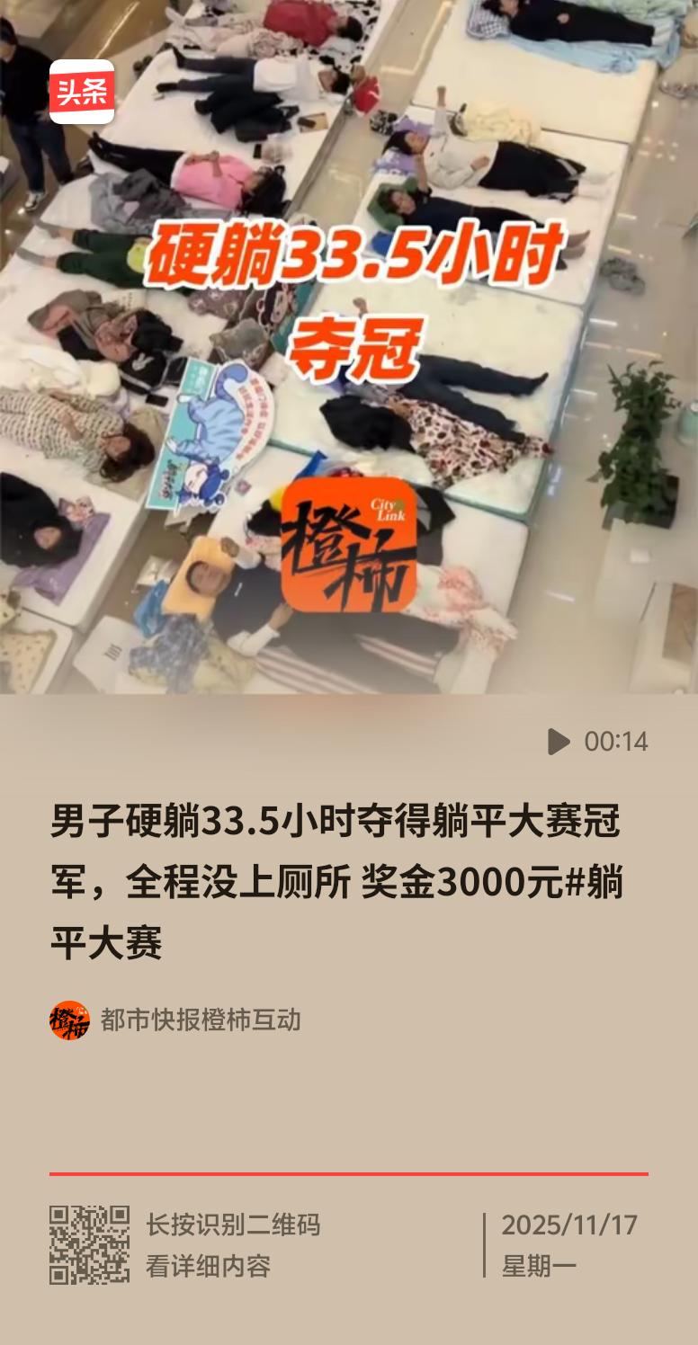 最近“躺平大赛”火了,有位男士躺33.5小时夺冠。11月16日,内蒙古包头这场比赛,24岁小伙从240名参赛者中胜出,拿走3000元奖金。这事儿在网上引发热议,有人觉得是打工人的“解压狂欢”,也有人吐槽是“摆烂到极致”。 在996和内卷的大环境下,年轻人压力大,“躺平”成了无声反抗。但33.5小时不动对身体肯定不好,把“躺平”当竞技也可能变成另一种内耗。其实真正的松弛是奋斗后有底气休息。就像这位夺冠小伙,中途多次想放弃,能坚持下来也是种别样的坚持。这比赛给了大家一个“合法摆烂”的窗口,不过生活的冠军还得靠一步步走出来。
