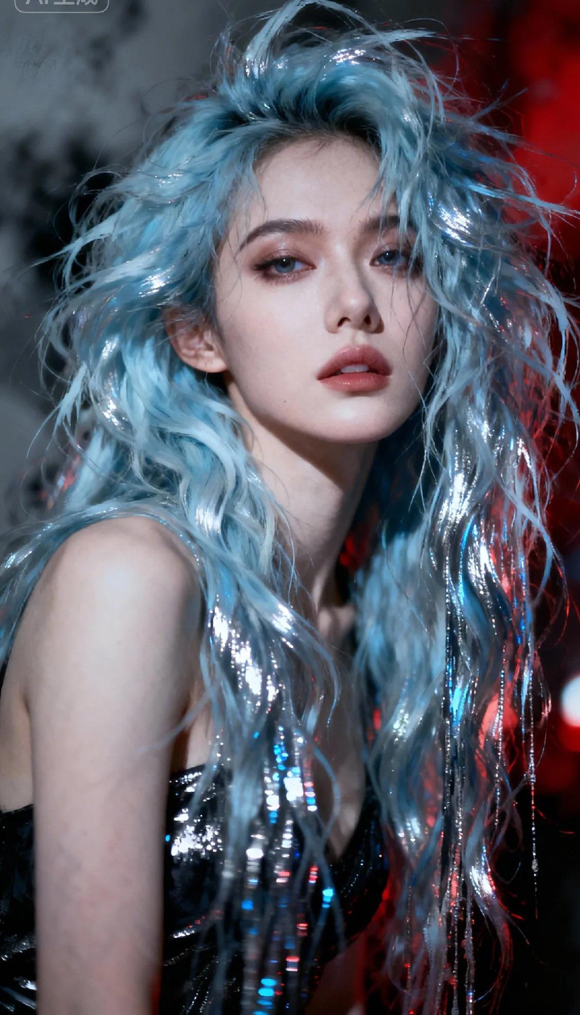 文案(适配社交媒体时尚类内容) 蓝银碎闪卷发浸在红调暗场里,亮面裙装的冷光和发丝的金属光泽撞出冷艳张力。AI织就的轮廓里,每缕卷度都裹着未来感——是赛博美学揉进复古妆面,也是冷感皮囊里的野生棱角。 要的从不是“像真人”,是这份介于虚拟与锐利间的、恰好踩在审美刃口的惊艳。酷炫新文案 别样文案