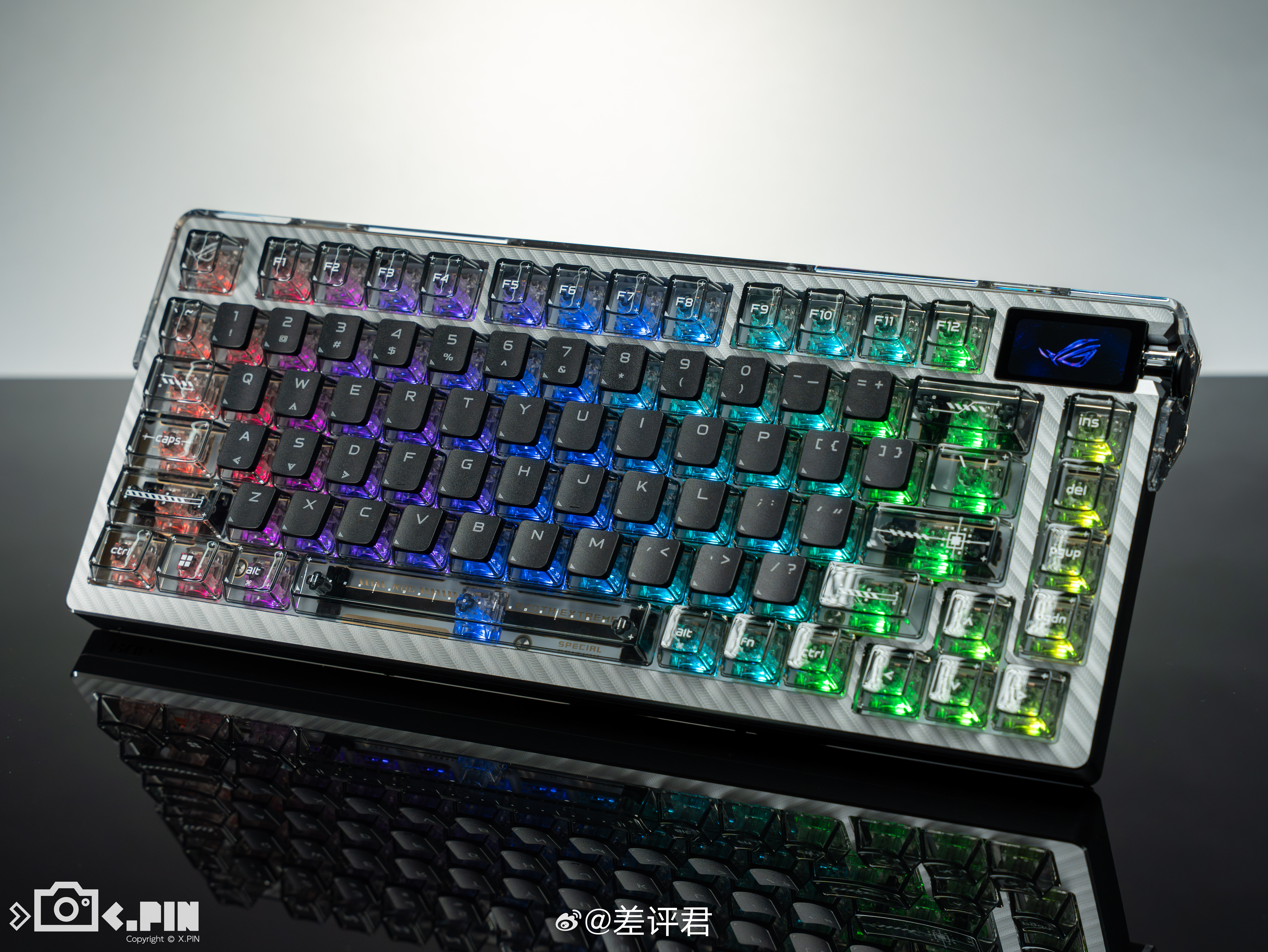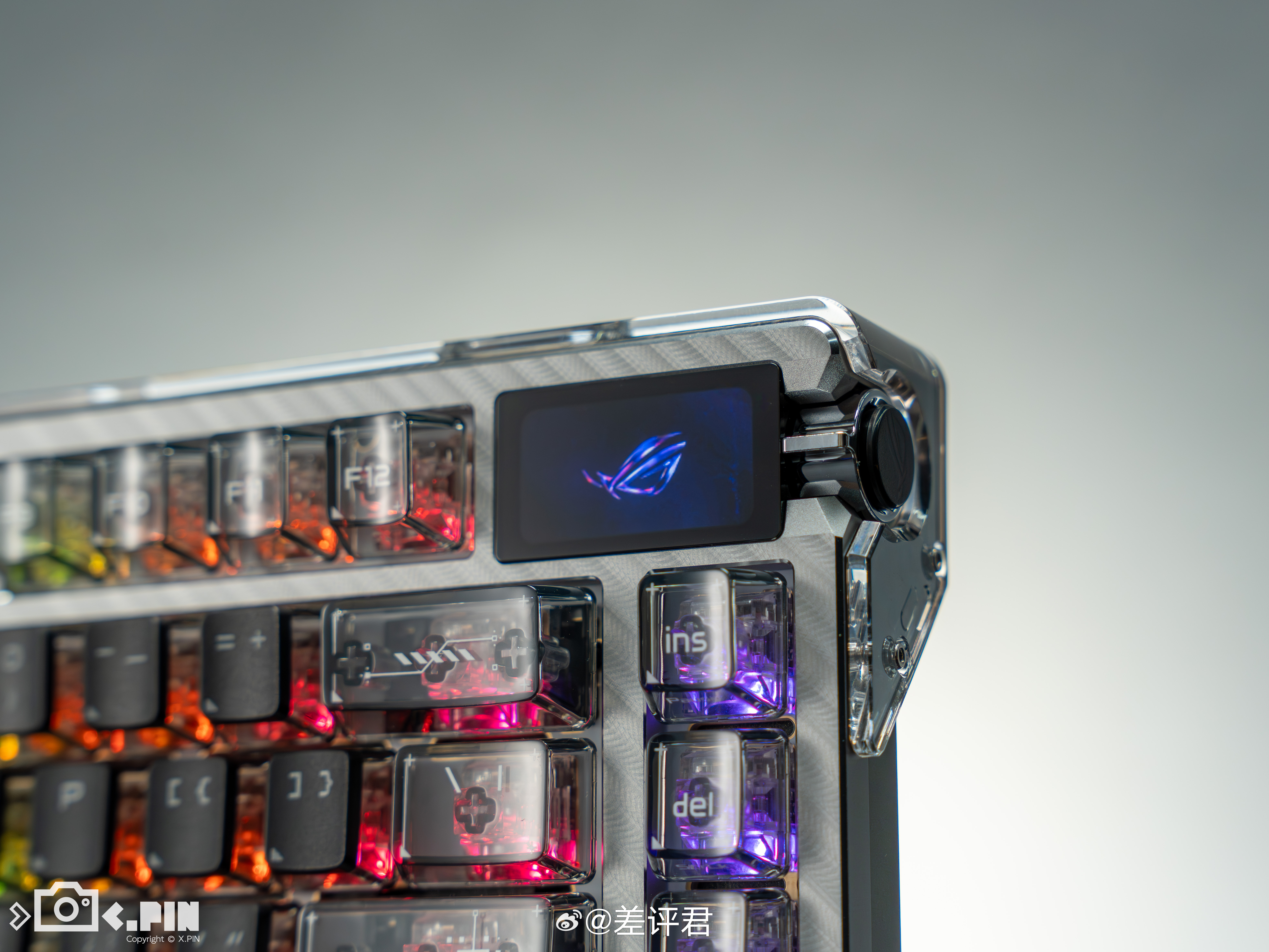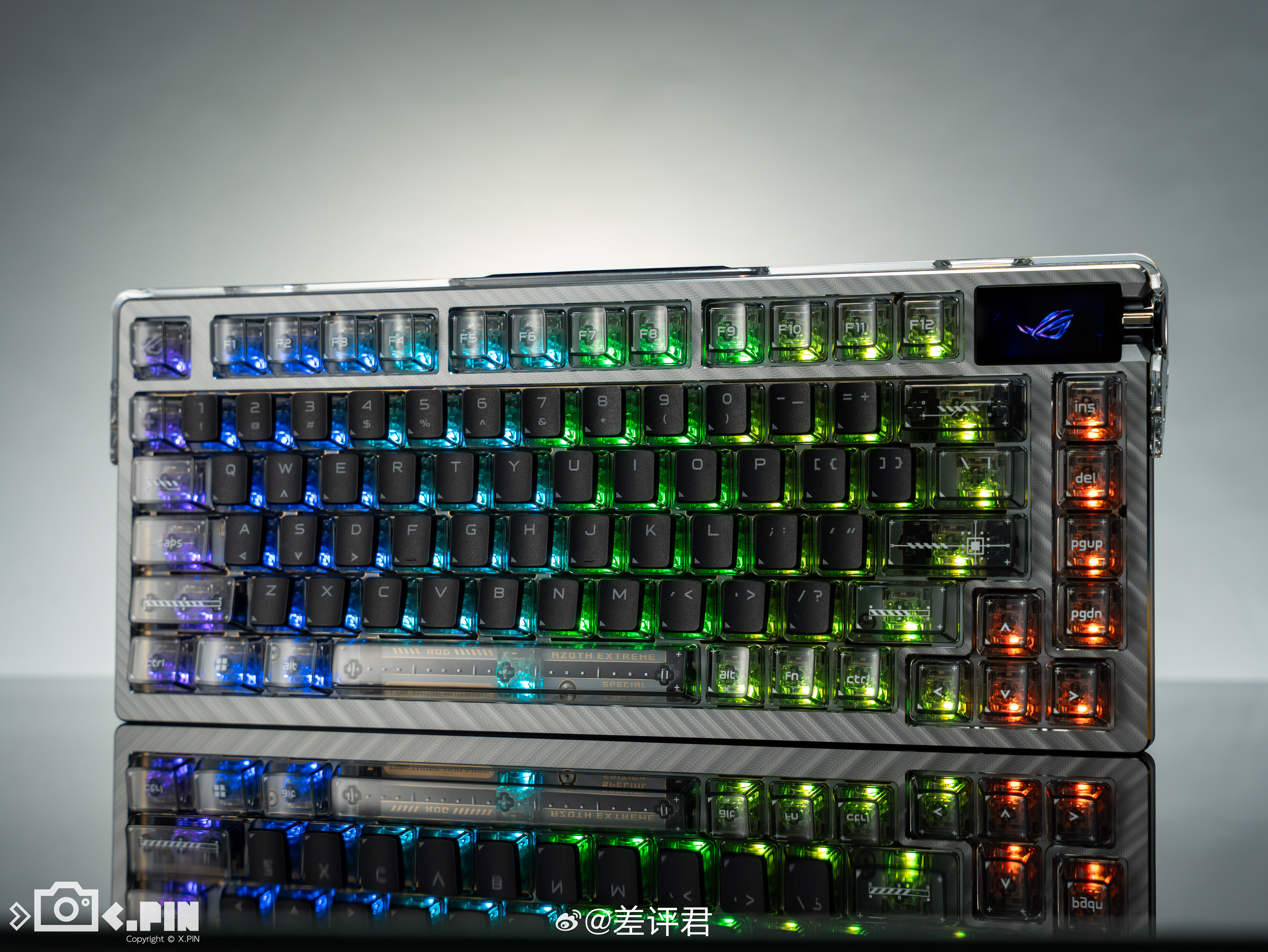 之前就眼馋 ROG 新出的这个夜魔 Extreme SE,拿到手发现做得是真可以啊,透明设计和金属外壳结合得很不错,就连脚垫都用上了透明磁吸的。另外 ROG 还给这批键盘定制了透明的轴壳,主打一个 RGB,但同时为了防止 RGB 一开看不清键盘,主键区特意用了高透PC+PBT结合的布丁键帽,这点好评。底壳中间的铭牌设计也很实用主义,打开来可以收纳无线接收器,同时里面有个拨片能调节 Gasket 手感。至于其他配置,这价格的键盘基本不用担心,FR4 定位板、ROG NX 机械轴、无线 8K 回报率啥的自然都安排上了。败家之眼是名副其实,但东西也确实好,感觉自用、富哥收藏、送人都蛮不错。哦对了,前两天我还从 ROG 那边薅了点周边回来,就顺带给大伙抽了吧,老规矩关注我+转发点赞,一等奖ROG电动螺丝刀,二等奖ROG朋克吸管随饮杯,三等奖天选姬鼠标垫,本周五 12 点开~