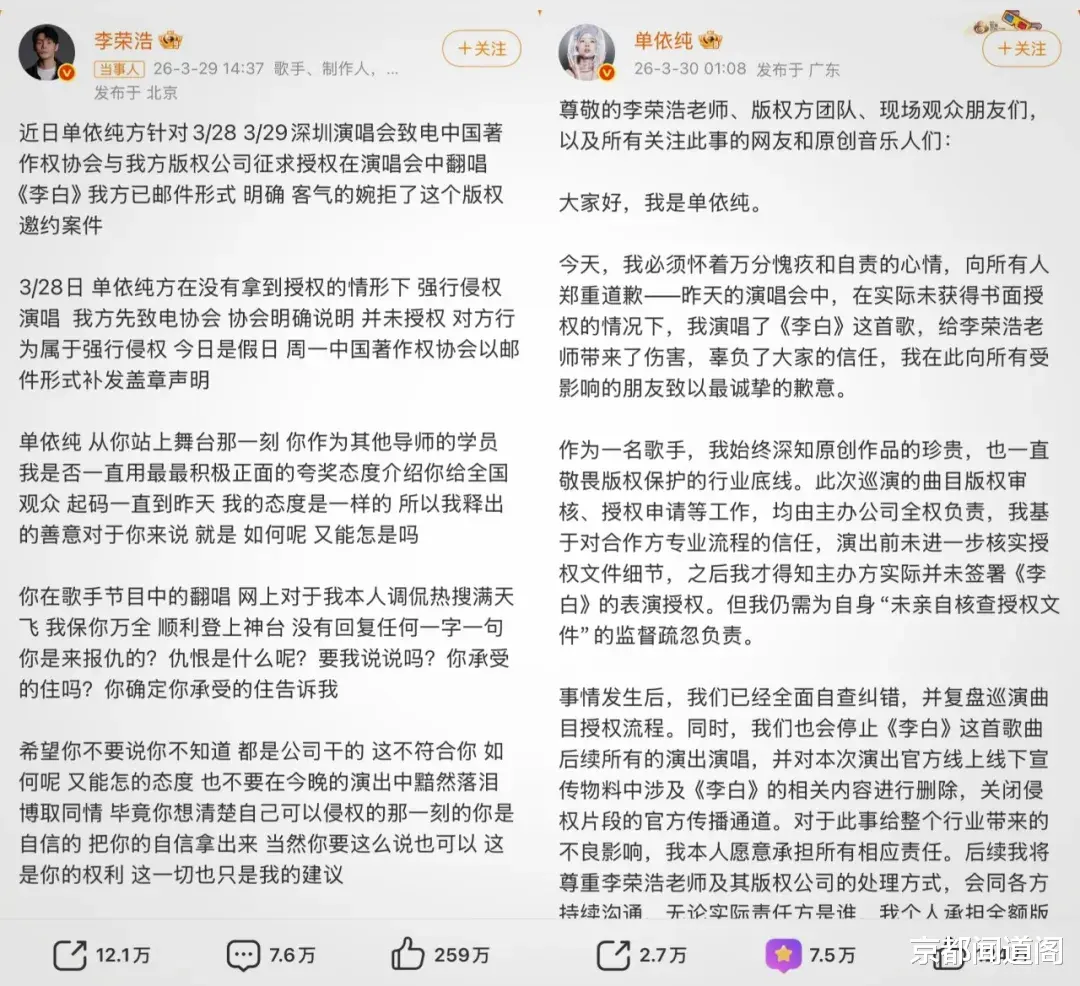 事件本身并不复杂:单依纯在巡演中演唱《李白》,此前申请授权未获通过,团队仍执意登台。事后她主动承认未亲自核查授权文件,坦然担责;李荣浩连发四问,质疑演出合规性,最终拒绝经济赔偿,只为守住创作者底线。从法律层面看,未经著作权人许可进行商业演出,已然触碰表演权红线,是非曲直,清晰可辨。