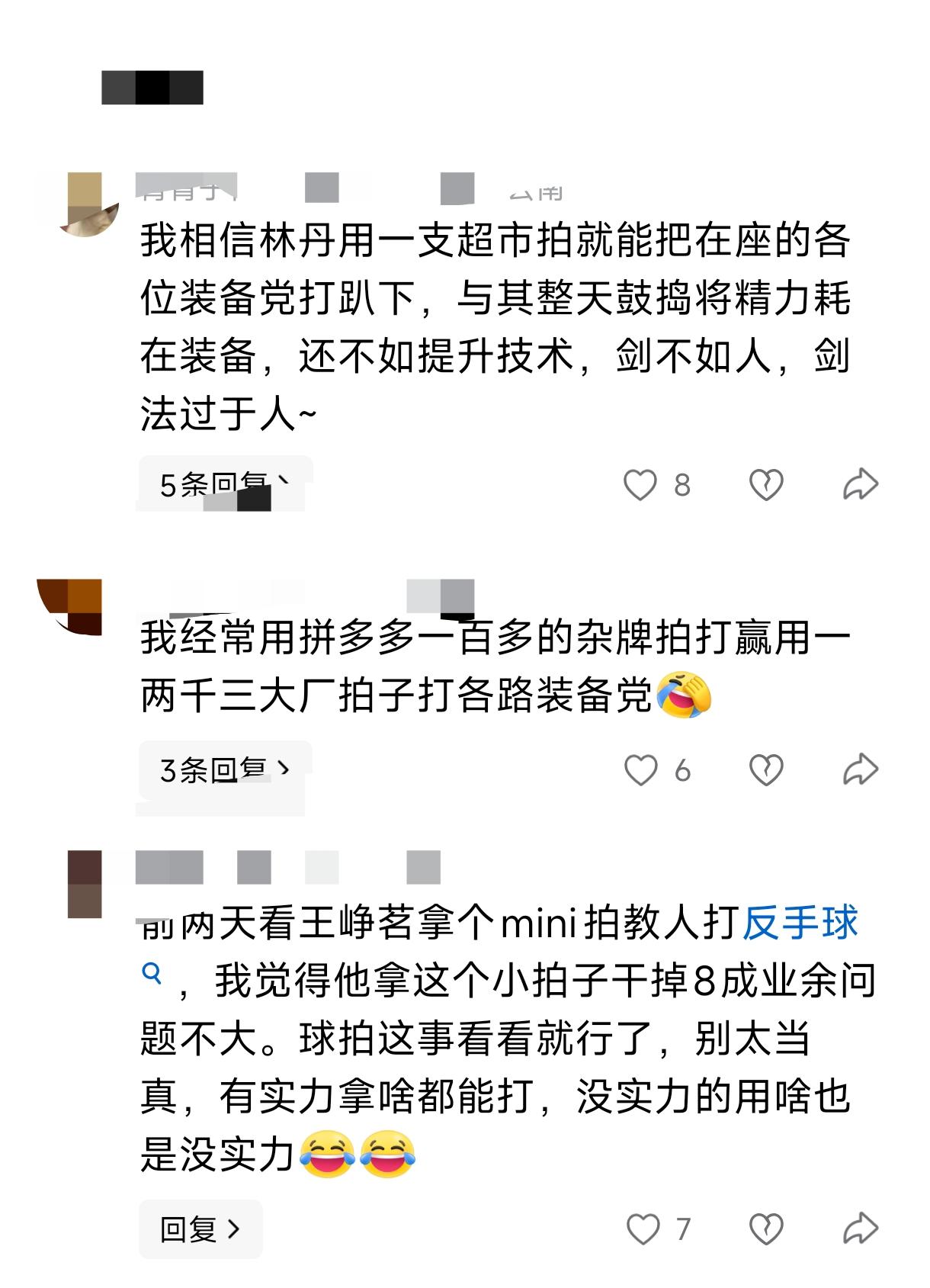 技术很重要,但精进技术和提升装备是起冲突了吗?为什么总有这种反智的想法呢。 林丹怎么不拿超市拍打比赛去呢?他是不是🧠有什么问题?打不过你叫他提升提术去啊! 我拿个超市拍能打赢任何幼儿园的小朋友,我骄傲了吗? 王峥铭如果是拿着mini拍干掉8成职业的,你再说这话会更有说服力。 你自己的水平在哪里,心理没点数吗?还提升,光一个发力就够业余新手练上几个月,甚至几年都不带长进的! 装备就不一样了,从铁拍到碳拍,那种感觉你再菜也能马上感受得到。千元拍不一定比几十块的所谓全碳素好打,但这不是拍子的错。 技术起高,你对球拍只会越讲究,因为你越能感知其中细腻的差别!如果一把高端拍你打着不如百元拍,只能证明你技术还没到家!