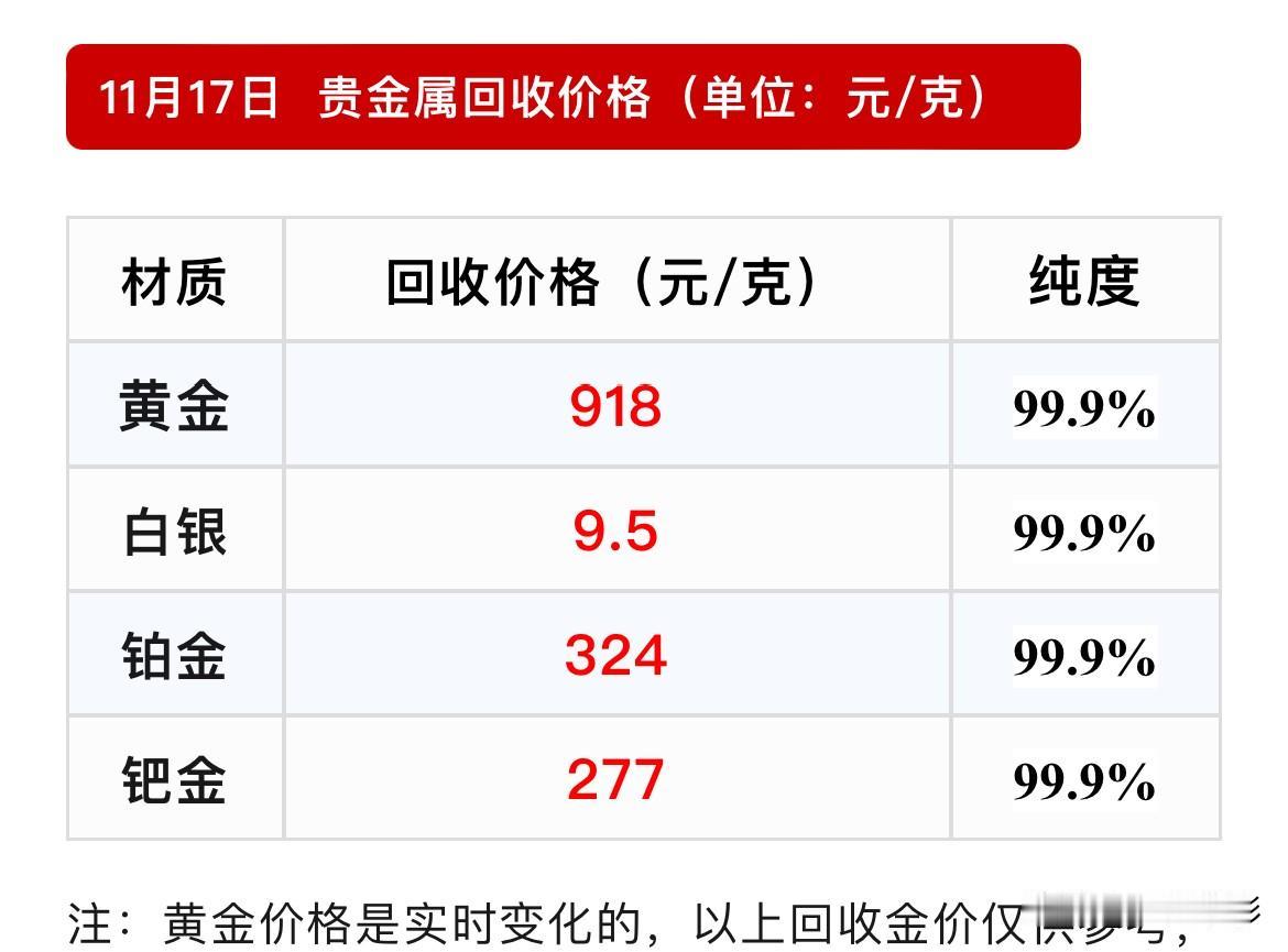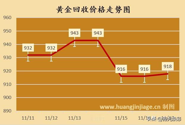 黄金回收价格查询 黄金回收价格918元/克, 铂金回收价格324元/克, 钯金回收价格277元/克, 白银回收价格9.5元/克。 黄金回收价格从11号的934元/克,一路飙升到13、14号的943元/克,再一路滑坡到今天的918元/克。 注:黄金回收价格是不看品牌、工艺的,因此知名品牌黄金和非品牌的金店的黄金回收价格是一样的。 黄金回收价格时时变化,所有回收价格,仅限于参考! 购买黄金有风险,请保持理性购买! 黄金参考 黄金价 黄金回收价攀升 黄金一克720 金价黄金回收 天价黄金回收 黄金预购价