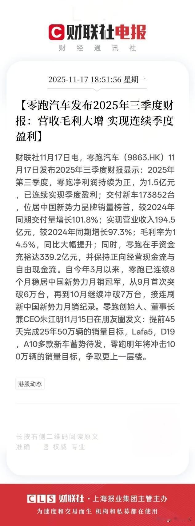 零跑发布Q3财报!营收、利润、毛利率多项指标创历史新高! 近日,零跑汽车公布了第三季度财报,从数据来看,本季度零跑在交付、营收、利润等多个维度实现突破性增长,其中,交付量达到173852台,实现营收194.5亿元,净利润达到1.5亿元,同比增长显著,更值得关注的是,毛利率提升至14.5%,连续多季度保持正向盈利,此外,企业现金储备达339.2亿元,为后续产品研发与市场拓展构筑了坚实的资金基础。 这一系列亮眼数据的背后,是零跑坚持“全域自研”战略的成果显现,多年来,企业持续投入核心技术研发,陆续推出的CTC电池底盘一体化、碳化硅电驱等创新技术,并已成功应用于多款新车型。同时,零跑始终秉持“好而不贵”的造车理念,打造出了B10、C10等多款热销车型,不断赢得市场认可。 在自身努力之外,来自地方政府的有力支持也为零跑发展注入了动能,浙江省各级政府累计超90亿元的资金助力,与企业技术积淀、市场策略形成合力,共同推动零跑迈入高速成长期。零跑汽车