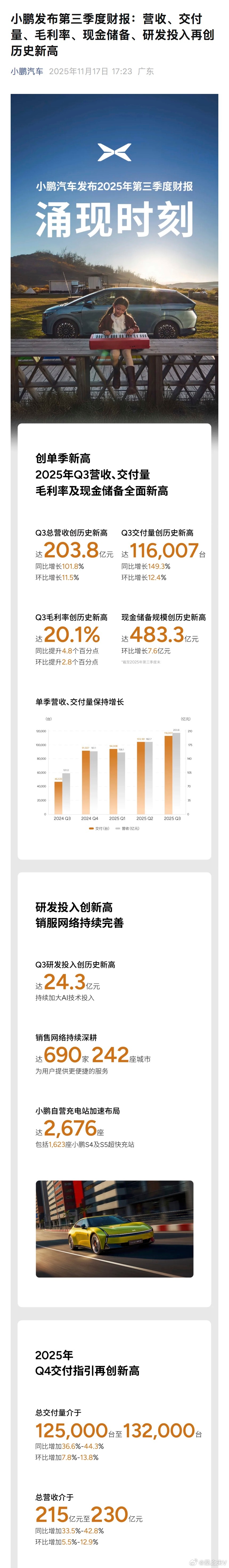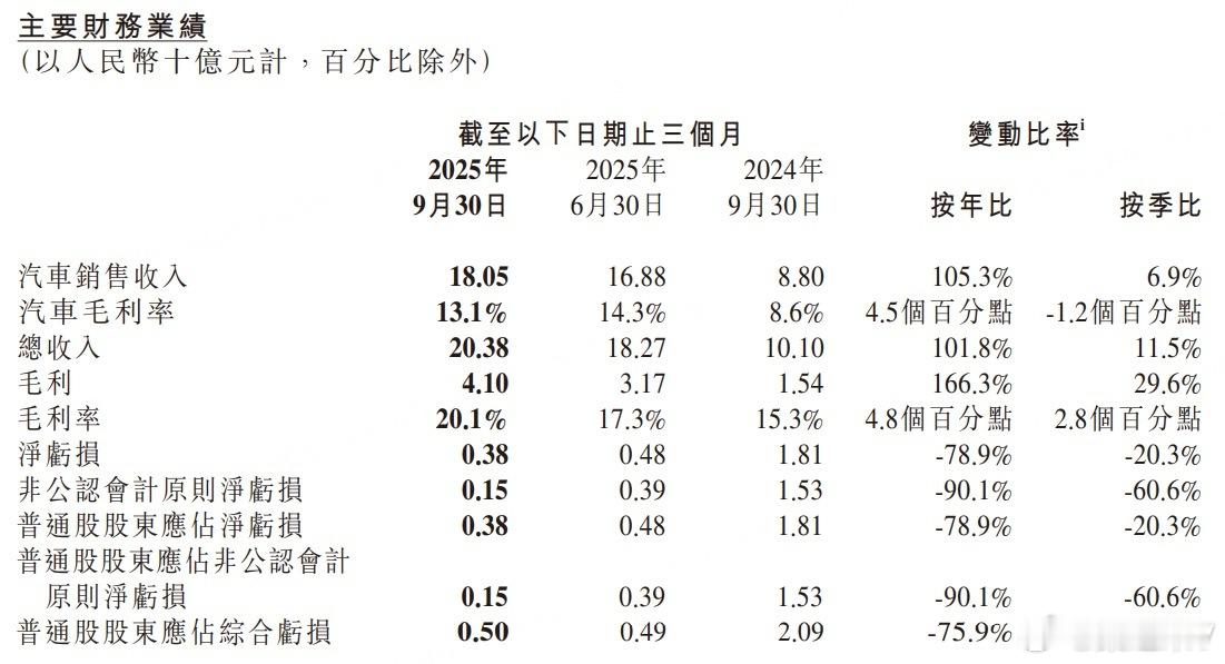 小鹏发布第三季季度财报,由于第四季度业绩指引低于预期,股价下跌。小鹏汽车预计第四季度营收215亿元至230亿元,同比增长约33.5%至42.8%,市场预估253.6亿元。小鹏第四季度业绩预估低于市场预期,主要是小鹏低端车型销售比例较高,如小鹏MONA 03在1-10月销售12.6万辆,销售份额从18.9%提升至46.1%。高端车型X9销售1.3万,份额从16.8%降至4%。小鹏第三季度营收203.8亿元,同比增长101.8%,市场预估204.5亿元;第三季度净亏损3.8亿元,同比收窄78.9%,市场预估亏损5.7亿元;第三季度毛利率为20.1%,同比上升4.8个百分点;第三季度汽车毛利率为13.1%,同比上升4.5个百分点。预计第四季度交付量125,000至132,000辆,同比增长约36.6%至44.3%,市场预估135,984辆。