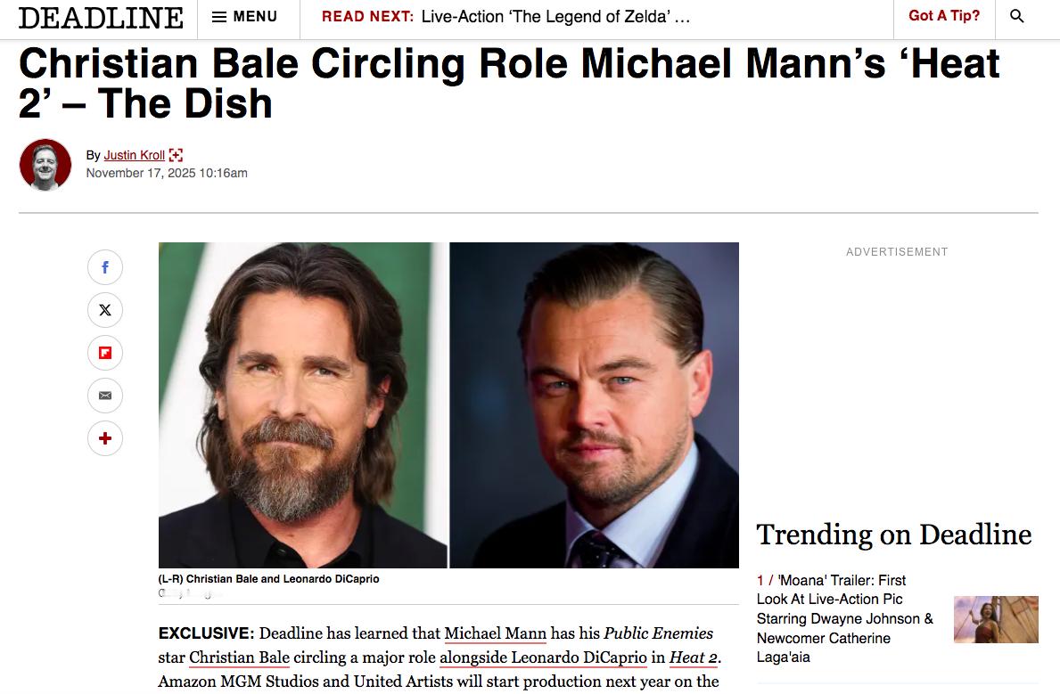 克里斯蒂安·贝尔考虑出演《盗火线2》,或将与莱昂纳多·迪卡普里奥同台飙戏