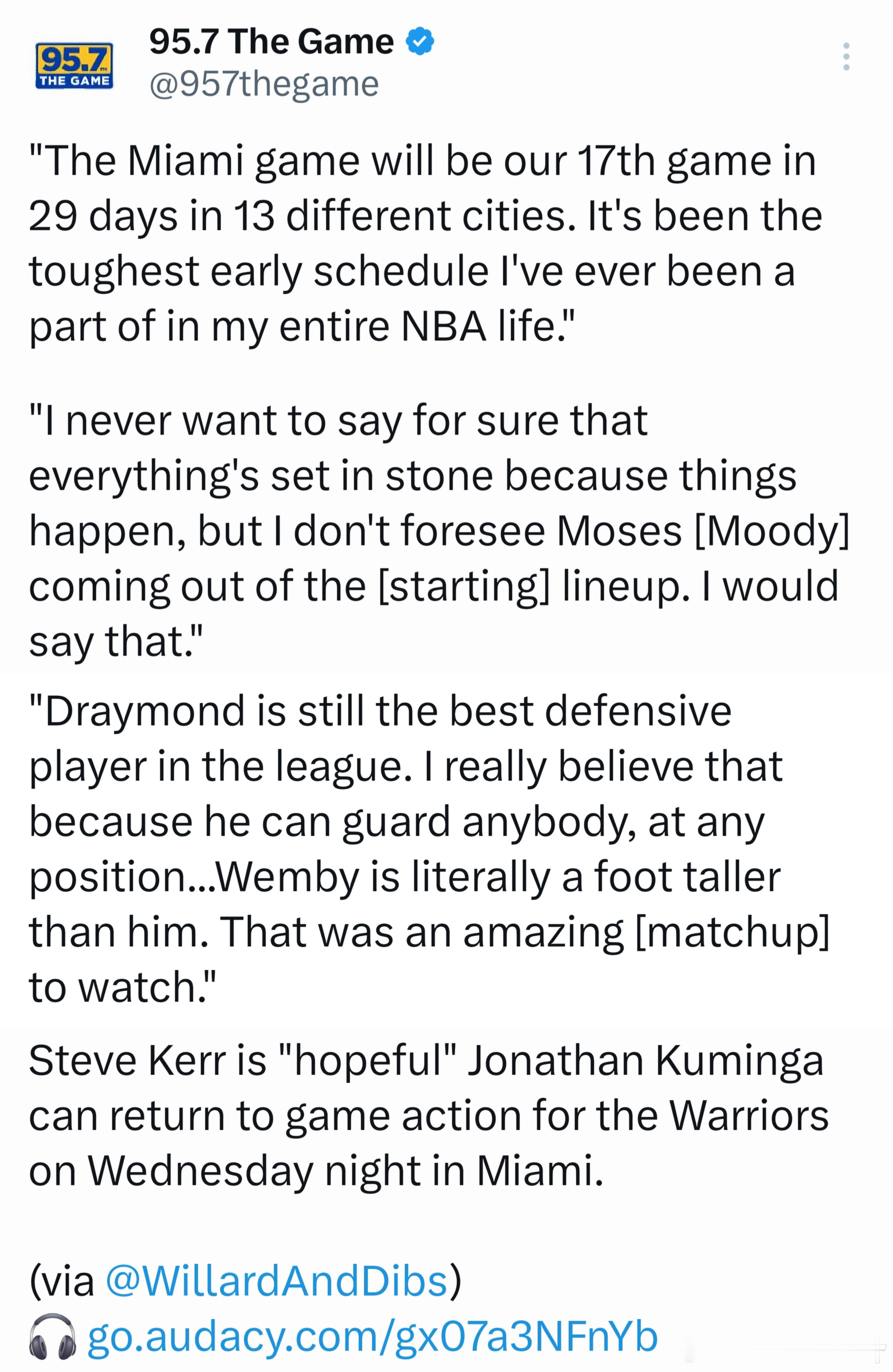科尔在电台节目中称,这是他经历过最艰难的赛季初期赛程,并称穆迪不会退出首发,希望库明加对热火复出。“对阵迈阿密的比赛,将是我们在29天内打的第17场比赛,横跨13座不同的城市。这是我整个NBA生涯经历过的最艰难的赛季初期赛程。”“我从来不想把话说死,毕竟什么都有可能发生,但我不认为穆迪会被移出首发阵容,我可以这么说。”另外,科尔称追梦仍是联盟最佳防守球员。"追梦仍然是联盟最好的防守球员。我真的这么认为, 因为他能防守任何位置的任何球员....文班比他高出足足一英尺,那场对决真是精彩绝伦。”