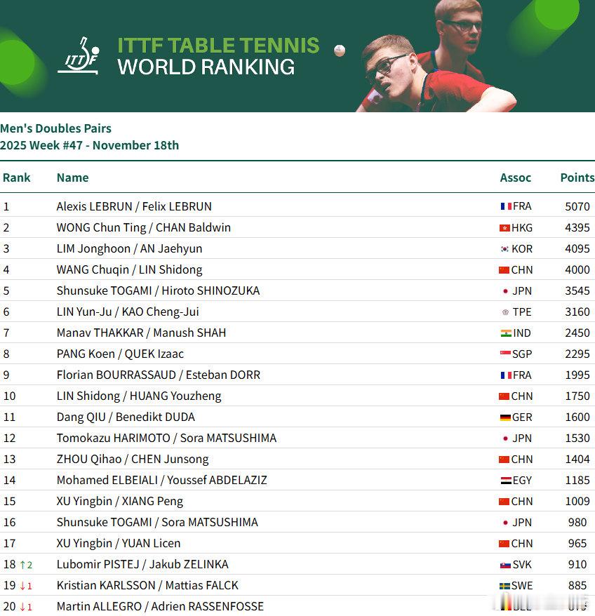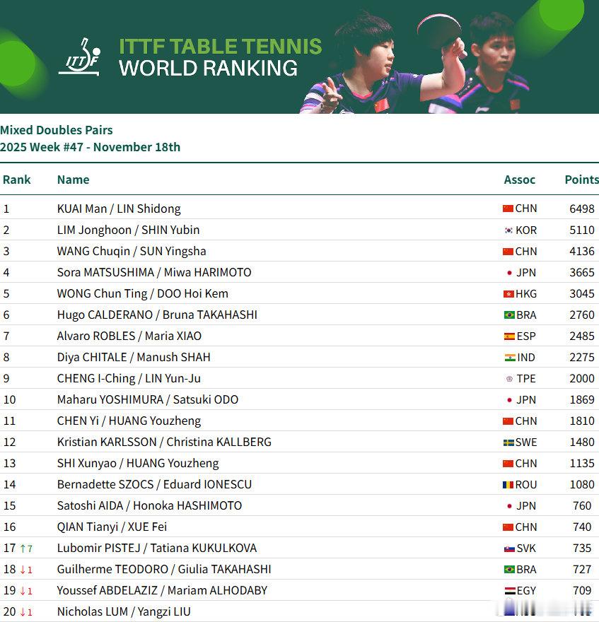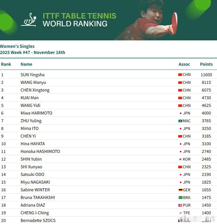 男单:王楚钦10900分、林诗栋位列前二,梁靖崑位列第6,向鹏第12女单:孙颖莎11600分、王曼昱、陈幸同、蒯曼、王艺迪位列前五,陈熠第9男双:王楚钦/林诗栋第4、林诗栋/黄友政第10女双:王曼昱/蒯曼第一、孙颖莎/王曼昱第四、蒯曼/王艺迪第7、孙颖莎/王艺迪第11混双:林诗栋/蒯曼第1、王楚钦/孙颖莎第3、黄友政/陈熠第11