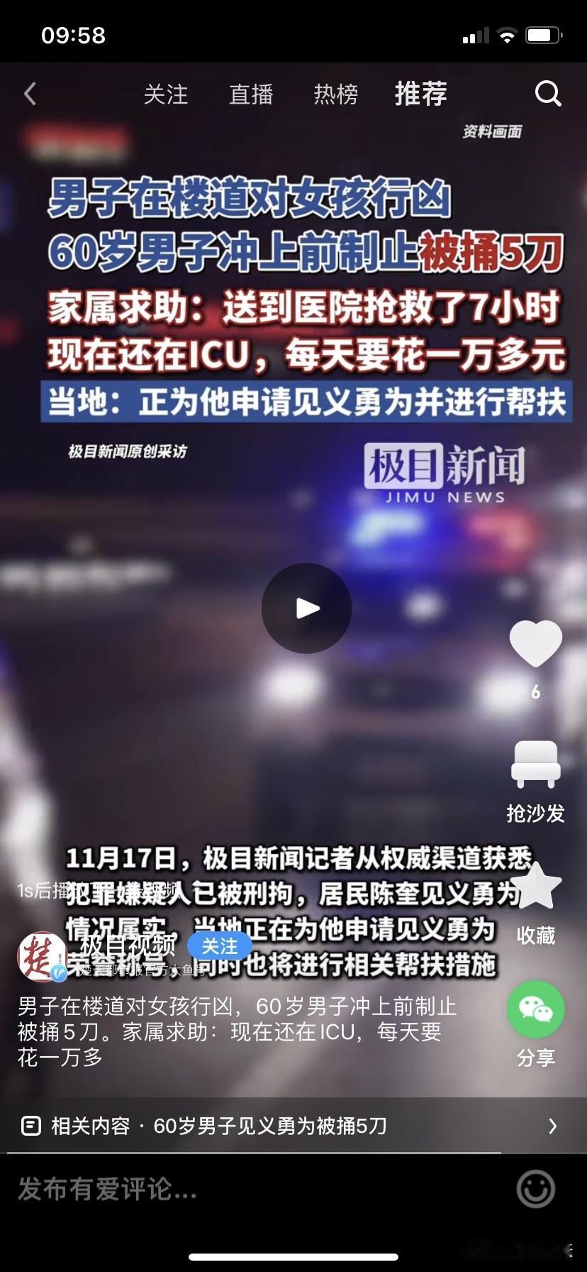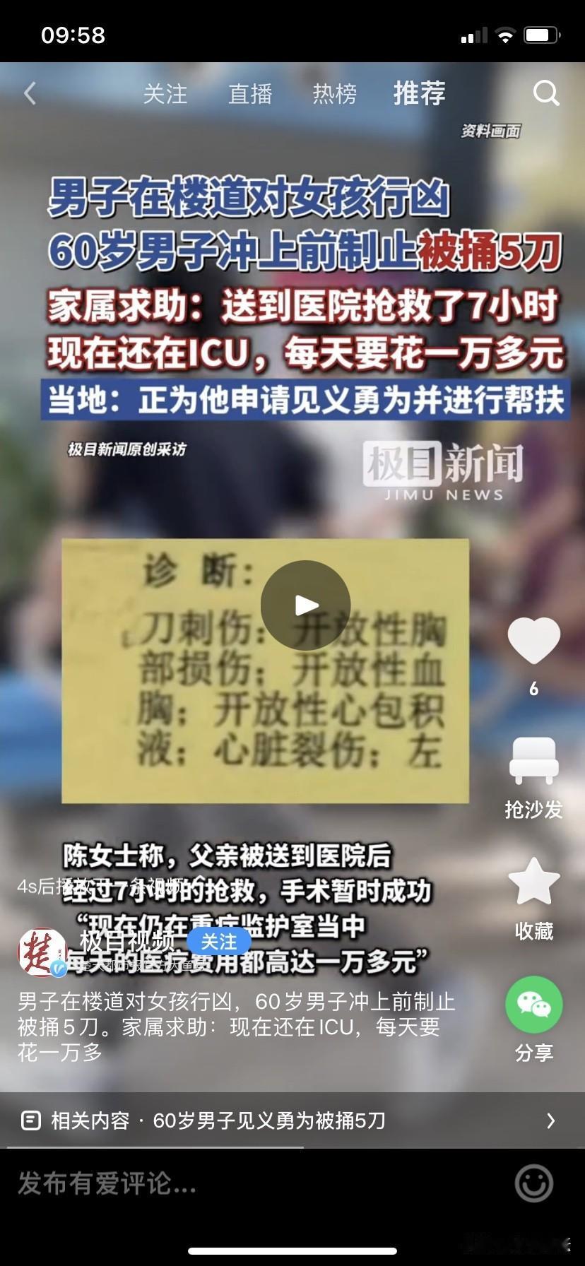 太可怕了,重庆一男子竟在楼道里对女人行凶。 一位来自重庆合川区的陈女士在网上发视频称:2025年11月13日,自己的父亲在家里休息时,忽然听到楼道里传来一个女人凄惨的呼救声,他急忙起来打开门一看,只见一个男人右手持刀正对着一个女人行凶,他急忙上前去制止,谁知犯罪嫌疑人转身用刀向父亲捅了五刀顿时鲜血直流,邻居们闻声赶过来报了警,犯罪嫌疑人被当场抓获,父亲被紧急送进医院,在医院抢救了七个小时,现在父亲仍在重症监护室,还没有脱离生命危险,每天要花费一万元的治疗费,高昂的治疗费让家中不堪重负。 目前,当地政府部门一位陈女士父亲申请了见义勇为称号,并对其家属进行了救助,希望陈女士的父亲能挺过这一关,希望救人英雄陈父能尽快康复。[祈祷][祈祷]