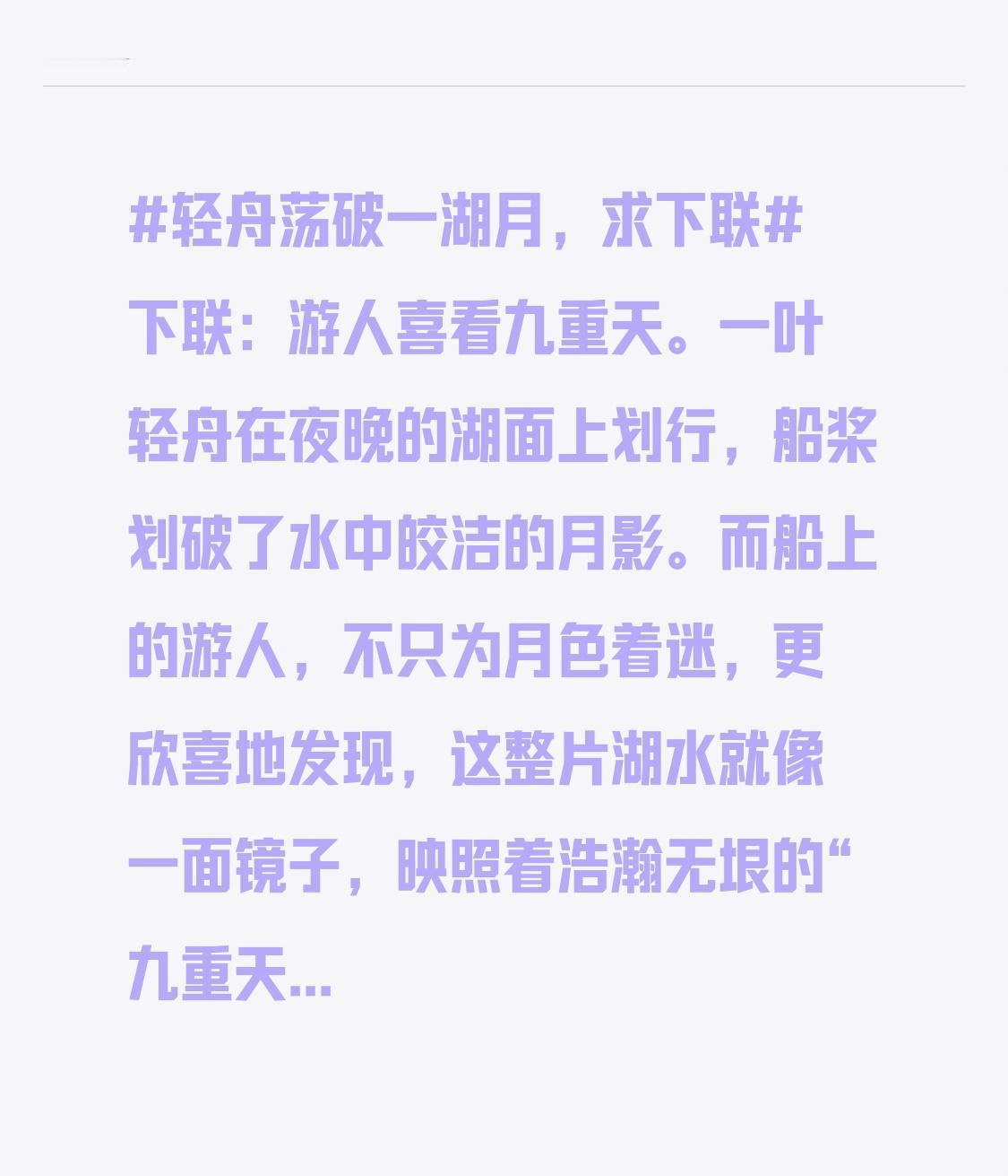 下联:游人喜看九重天。 一叶轻舟在夜晚的湖面上划行,船桨划破了水中皎洁的月影。而船上的游人,不只为月色着迷,更欣喜地发现,这整片湖水就像一面镜子,映照着浩瀚无垠的“九重天”。舟在行,水在动,天光云影在水中共徘徊。