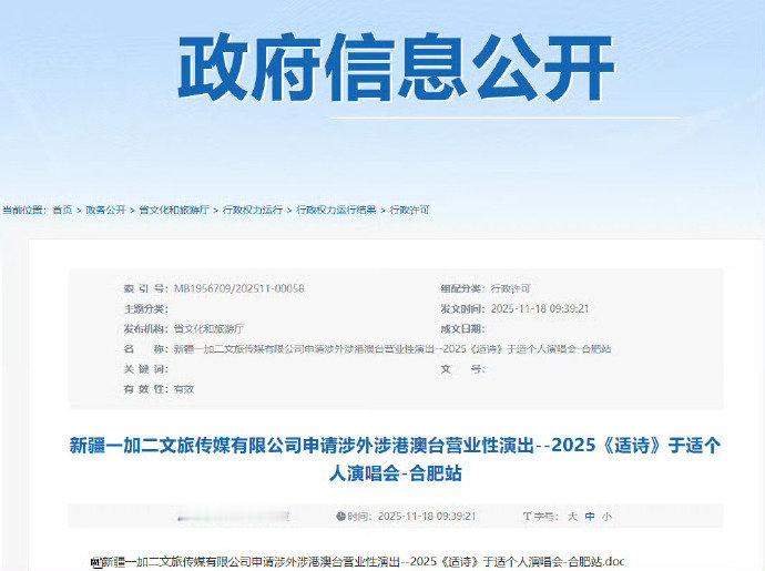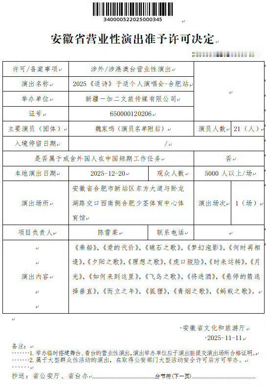 于适首场演唱会合肥站过审下证12月20日、合肥少荃体育中心体育馆,期待歌手于适