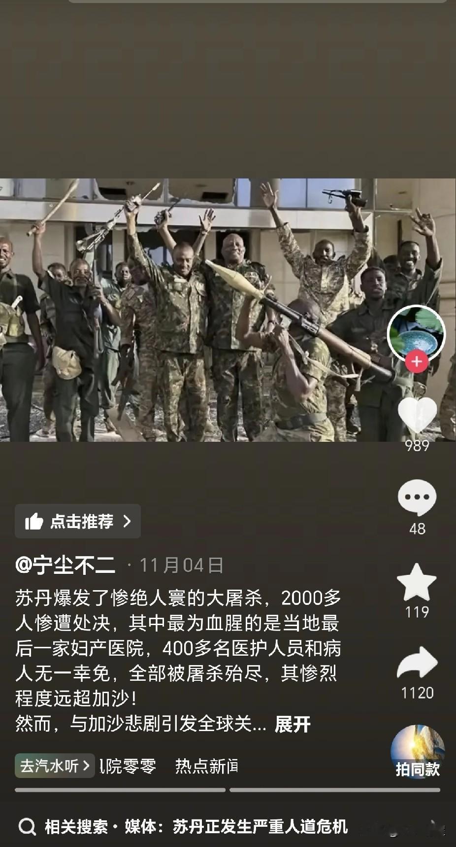 苏丹那边最近出了天大的惨事!那个叫“快速支援部队”的准军事队伍,打下法希尔这座城之后,居然开始屠城了——足足1500个平民没躲过,全被害死了。就连沙特那边办的医院都没能幸免,里面450个病人和医护人员,直接被他们用枪扫射,地上的血多到卫星从天上都能看见,想想都让人头皮发麻! 那些好不容易逃出来的人说,城里简直是人间地狱:叛军白天晚上都用无人机和步枪追着人杀,根本不给活路,有些人跑的时候连鞋子都被抢走了,光着脚拼命逃。 联合国一看这情况急坏了,赶紧拨了2000万美元救急,可还是警告说,这“灾难性的黑暗”还没结束——救援的路被叛军挡住了,城里的老人、小孩、残疾人还有受伤的人,全都被困着出不来,连口吃的喝的都难弄到,处境太危险了!