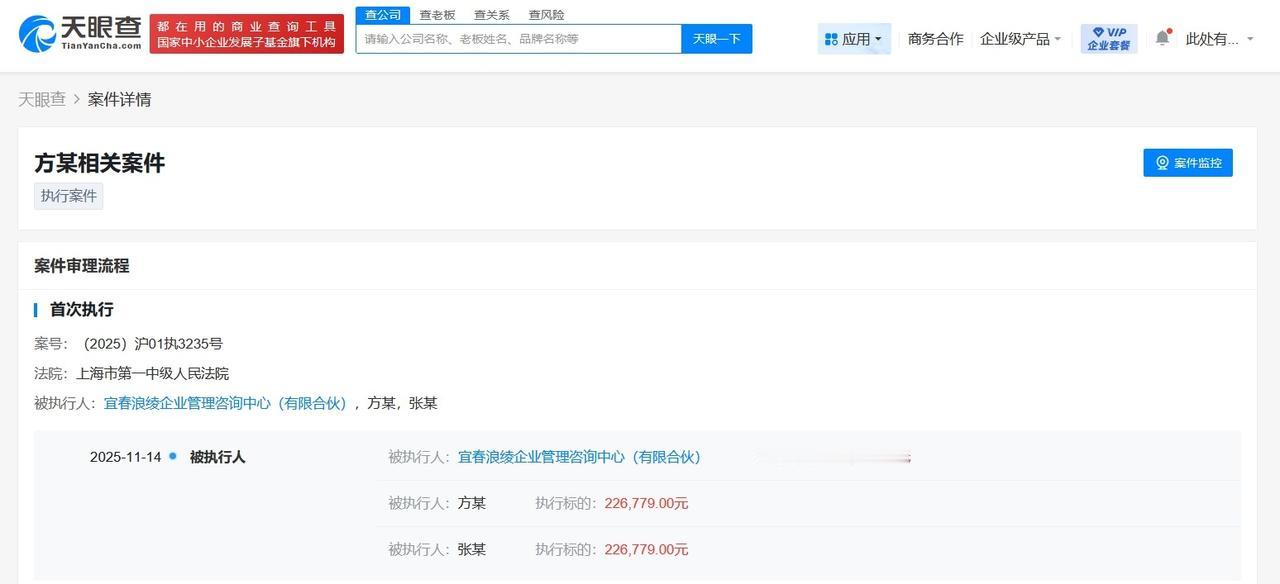 哪吒汽车张勇成被执行人 哪吒汽车张勇等被执行36.5万 天眼查天眼风险信息显示,近日,方运舟、张勇、宜春浪绫企业管理咨询中心(有限合伙)新增两则被执行人信息,执行标的合计36.5万余元,执行法院为上海市第一中级人民法院。 宜春浪绫企业管理咨询中心(有限合伙)成立于2021年10月,执行事务合伙人为方运舟,出资额548万人民币,经营范围为社会经济咨询服务、信息咨询服务。合伙人信息显示,该咨询中心由方运舟、张勇等40余位合伙人共同出资。
