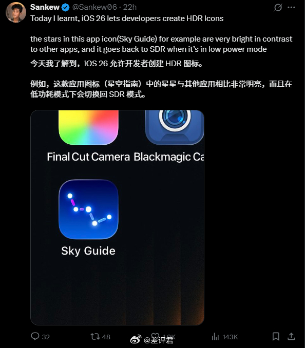 iOS 26 竟然允许开发者给 App 图标上 HDR?这如果被一些电商 App 用上了,那一搞促销活动啥的,就会连图标上的小广告都是带 HDR 的,到时候这手机桌面会是怎么一副景象我都不敢想。。。