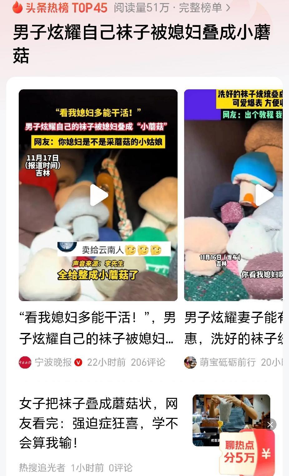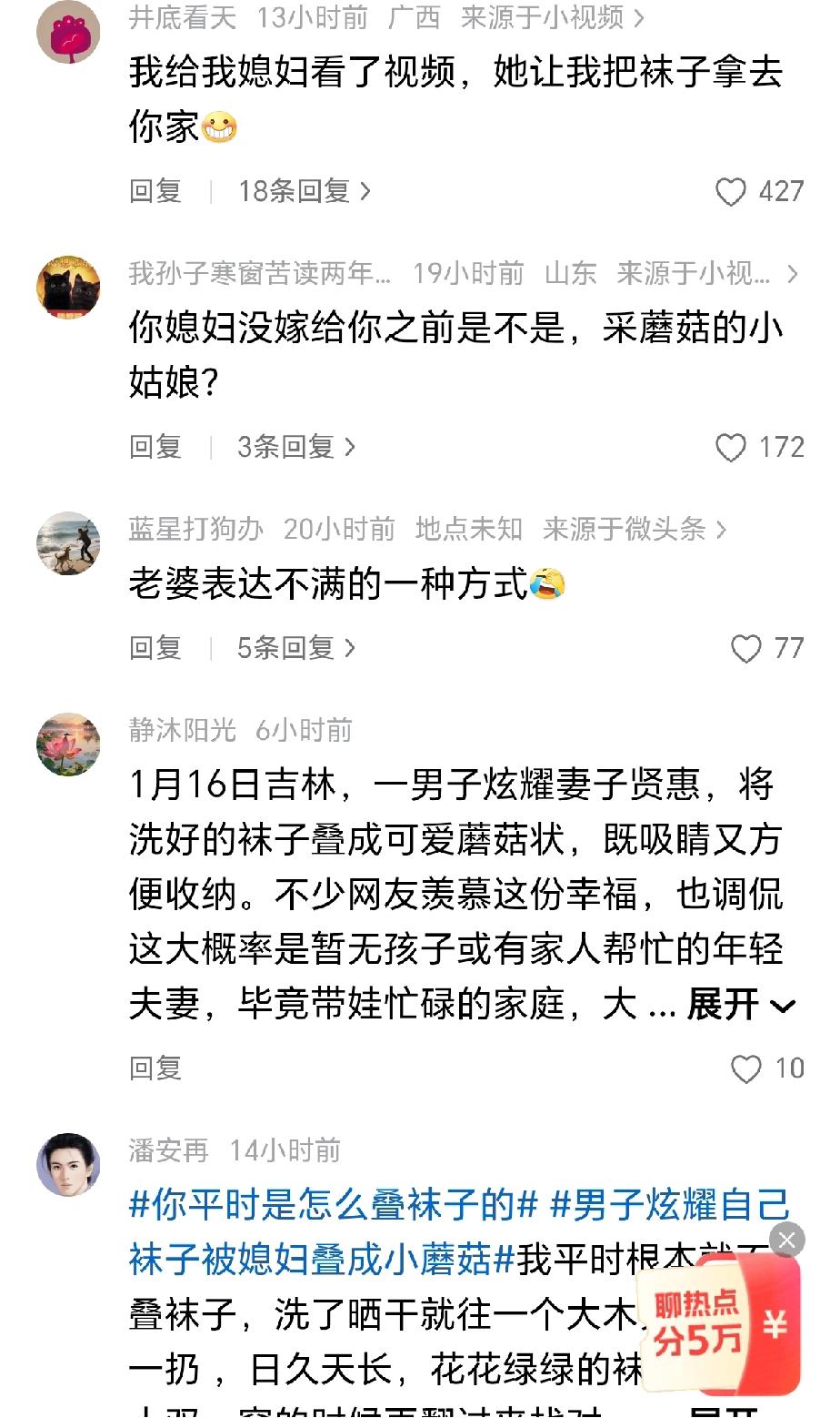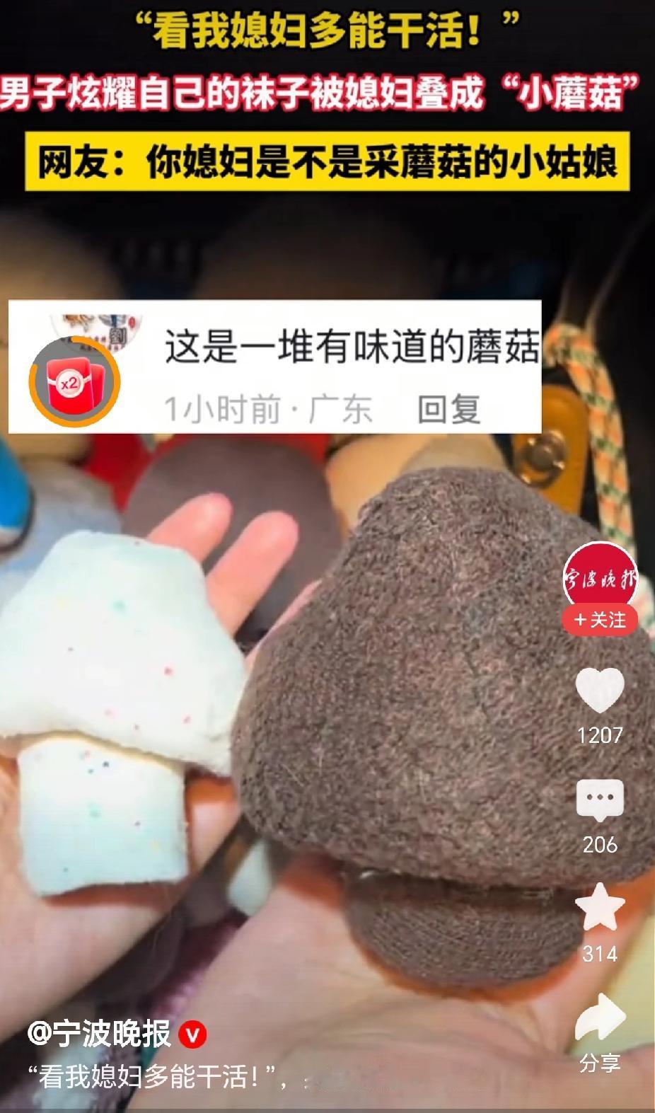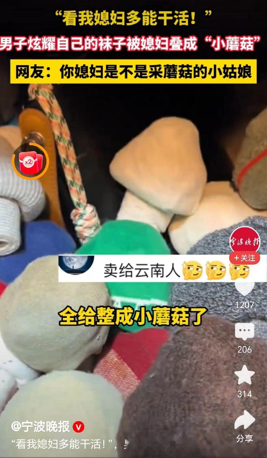“能干了,男子炫耀自己袜子被媳妇叠成小蘑菇!”近日吉林,男子拍视频炫耀自己的袜子被媳妇叠成了一个一个五颜六色的“小蘑菇”。网友:你媳妇是不是采蘑菇的小姑娘?(来源:@宁波晚报) 据视频报道,吉林的一位男子发视频称,看我媳妇多能干活!视频中,男子的媳妇将刚收下来的袜子叠成了漂亮的小蘑菇。 这是刚晾干收下来的袜子,袜子还藏满了阳光的味道。媳妇那双灵巧的双手,将袜子摊开,然后卷起来,漂亮的小蘑菇就做好了。 由于袜子的颜色不同,这些小蘑菇有绿色的,有红色的,有棕色的,还有白色的,堆放在一起,琳琅满目,特别漂亮! “这是一堆有味道的蘑菇!”有网友评论说,这袜子叠的真好呀,一个一个的活灵活现,只是放着会散发着一股独特的味道。 “他媳妇也太有才了吧!”有网友评论说,这是一位心灵手巧的媳妇,将生活过得这么有滋有味,肯定得到了爱的滋润! “老婆表达不满的一种方式!”也有网友评论说,这可能是老婆对你不满了,没有及时关注到媳妇的情绪,通过叠蘑菇来引起男子的注意! 是呀,在家庭生活当中,夫妻之间的互动是特别需要的。如果媳妇在开心快乐的情况下,你的这些小蘑菇肯定是表达心中的爱意呀。 如果媳妇在不满的情况下,把时间放在叠袜子上,确实是需要丈夫的关注。一家人过生活是好还是坏?只有当事人知道!愿大家都把生活过得像小蘑菇一样可爱吧。 对此,你的看法是怎样的呢? 男子炫耀自己袜子被媳妇叠成小蘑菇 @秋实99 关注人生冷暖,拥抱幸福生活!