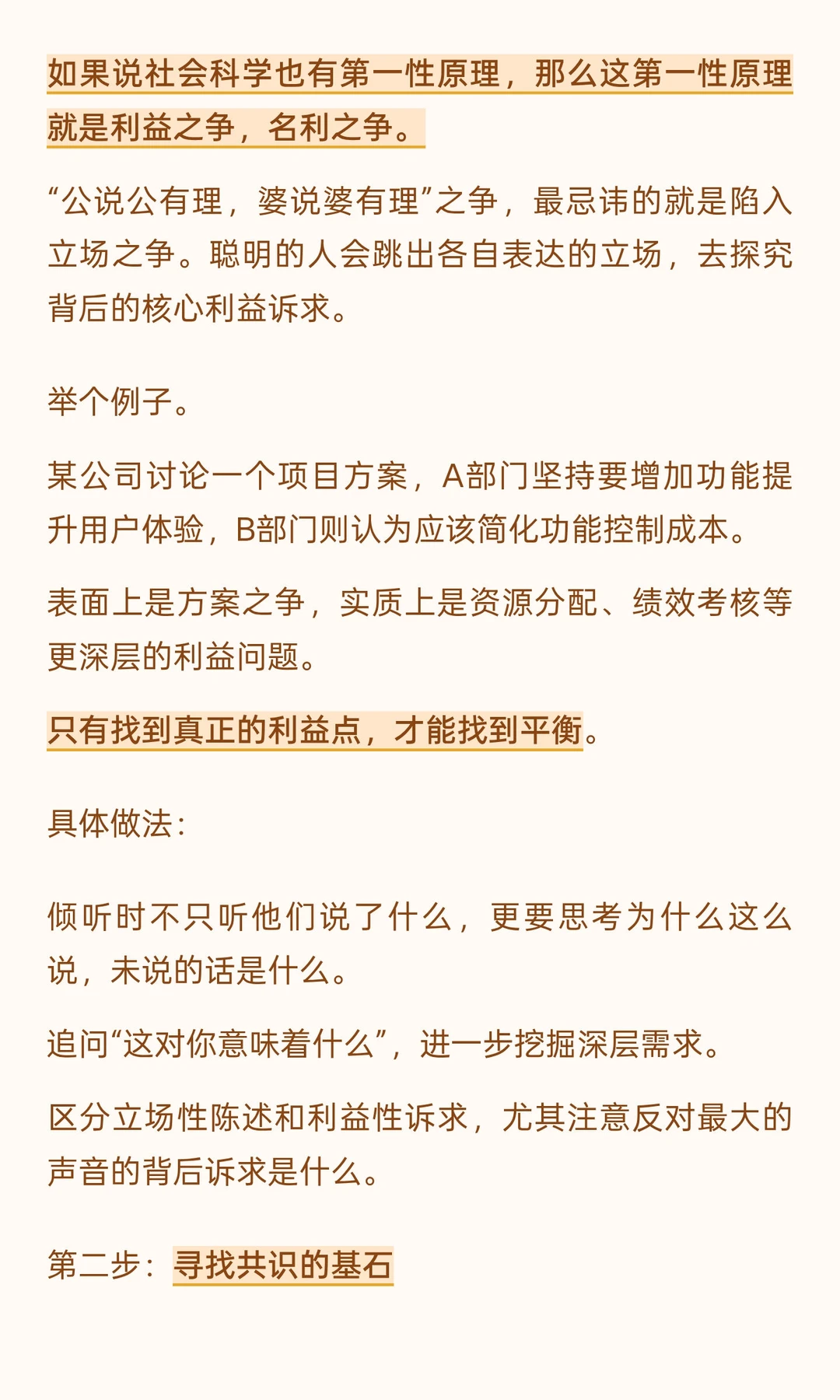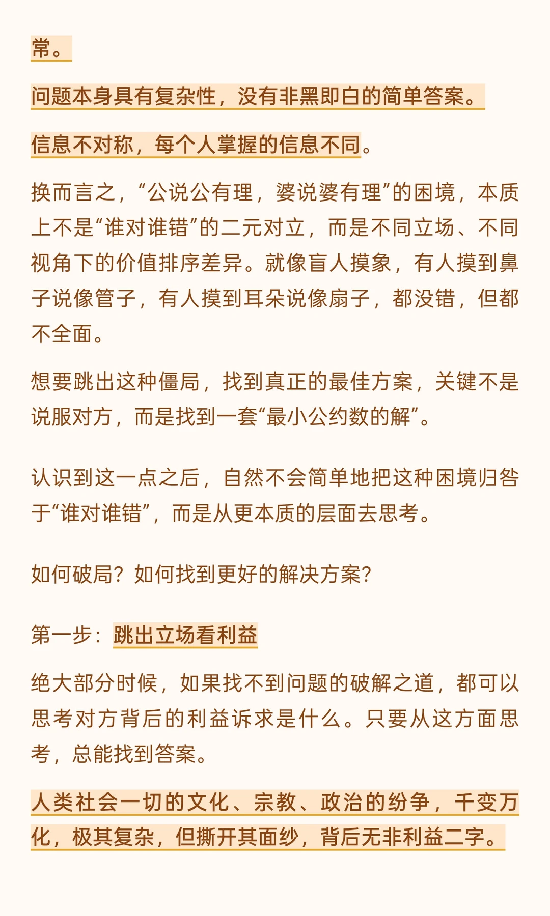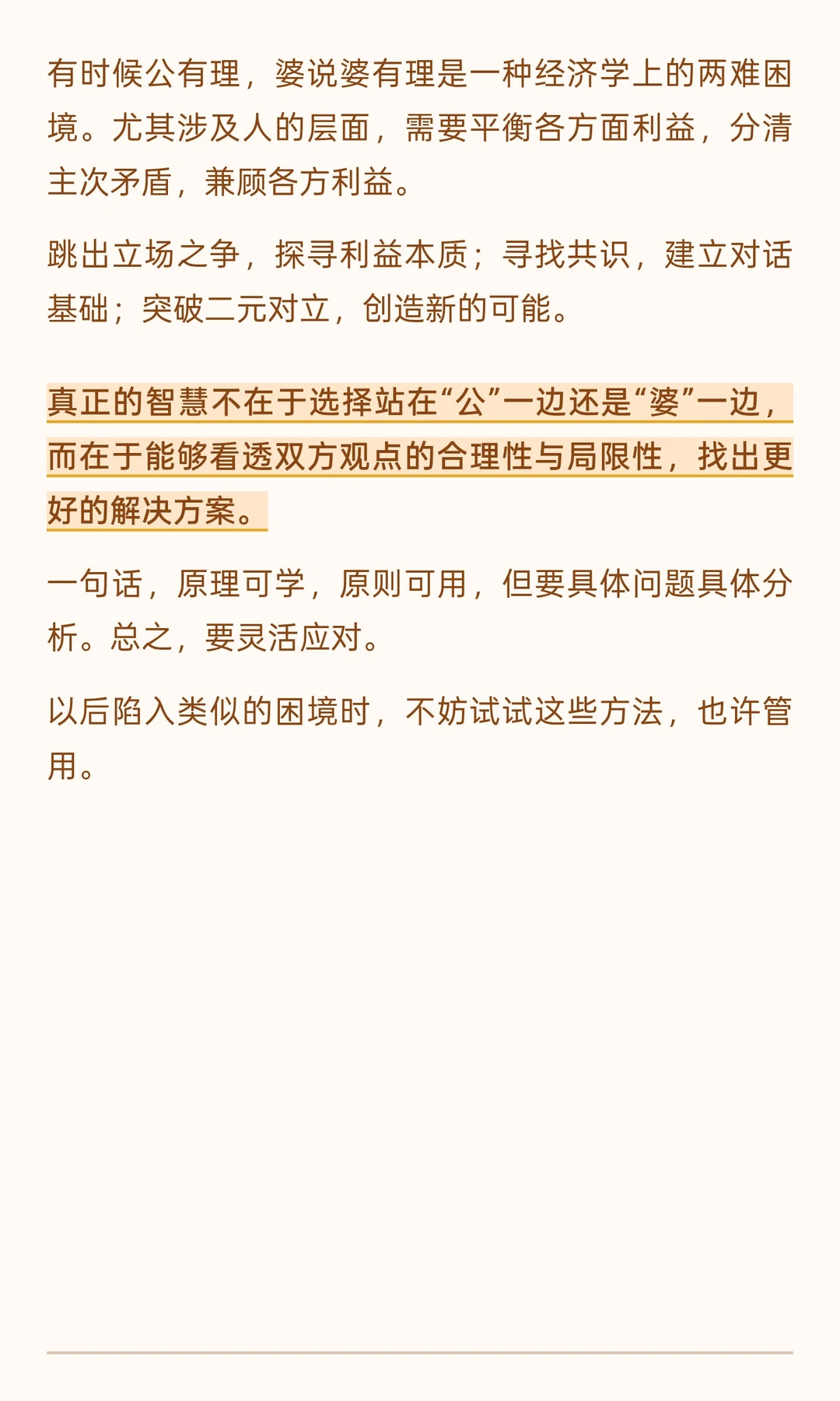 “公说公有理,婆说婆有理”之争,最忌讳的就是陷入立场之争。聪明的人会跳出各自表达的立场,去探究背后的核心利益诉求。