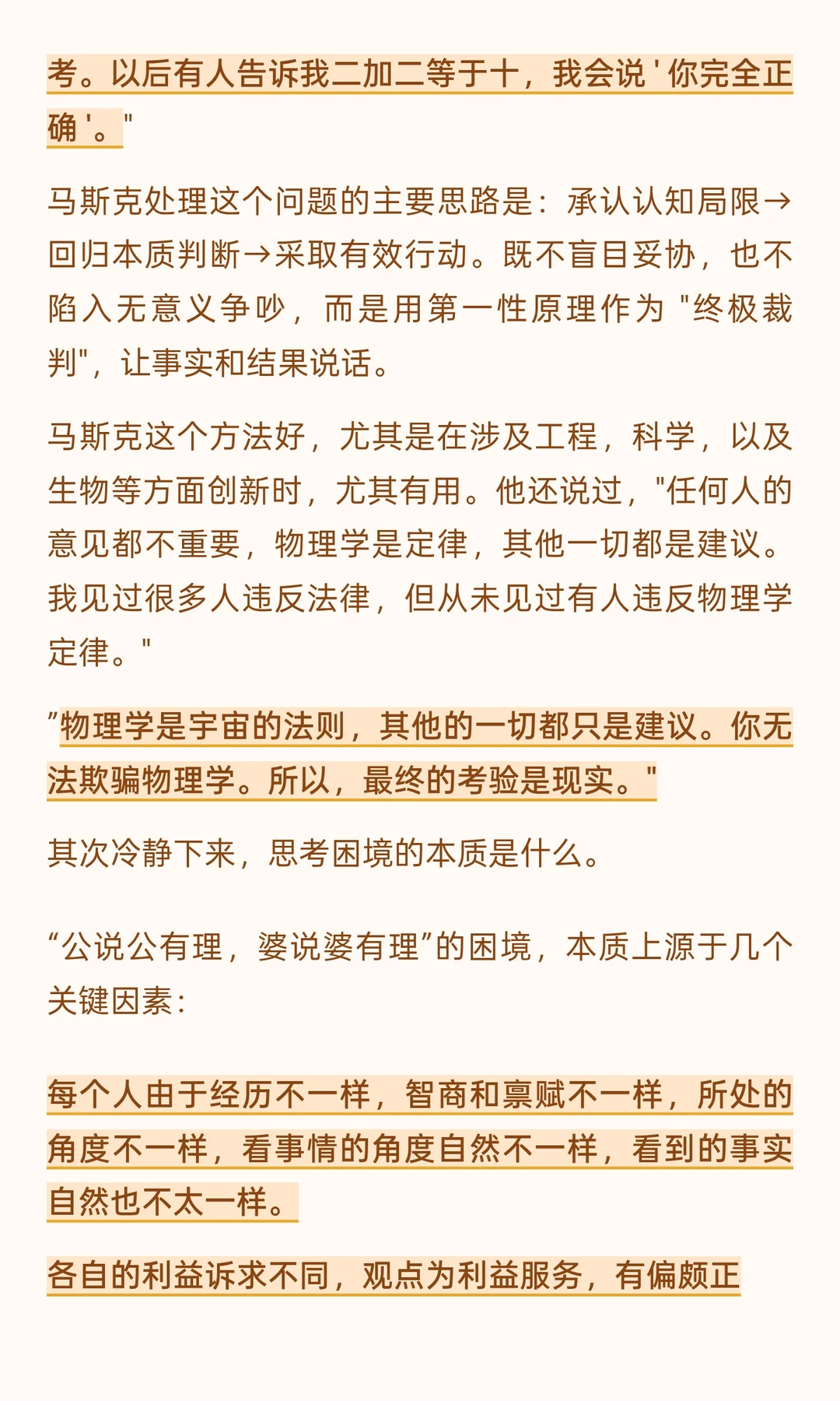 马斯克处理这个问题的主要思路是:承认认知局限→回归本质判断→采取有效行动。既不盲目妥协,也不陷入无意义争吵,而是用第一性原理作为 "终极裁判",让事实和结果说话。