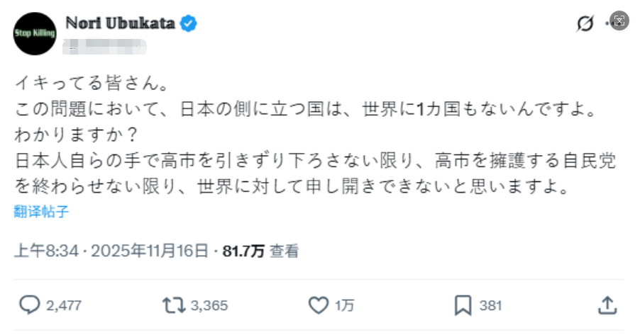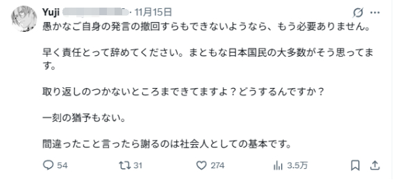 日本首相高市早苗近日发表的涉台错误言论罔顾法理和历史事实,一系列言行危害地区稳定、祸及日本自身,引发日本网民的担忧和强烈声讨。在各大日本网站上,大量网友发帖揭批。多位网友评论称,日本首相的言论明显加剧地区紧张局势,日本不应利用台湾问题谋取政治私利,而应优先通过对话与外交维护地区稳定。网友“Yoshinop”在日媒报道下评论道:高市首相的言论违反了《中日和平友好条约》第一条的规定。原本自卫队就是用于自卫的军队,若日本在台湾有事时主动发起攻击,这是违反《宪法》第九条的行为。在社交平台X,有大量网友在“希望高市首相辞职”“高市首相停手吧”等词条下用日文跟帖评论,希望高市早苗尽早正视问题的严重性,撤回声明并道歉,避免中日之间产生更大的隔阂。网友“Yuji”发帖称,请高市早苗承担责任,尽快辞职。说错话道歉是作为社会成员的基本原则。网友“kigenyoshio”认为,如果首相在没有得到全国共识的情况下,就擅自宣布日本对台湾进行军事干预,那会让事态变得很麻烦。网友“Norl Ubukata”说,在这一问题上,世界上没有任何国家会站在日本这一边。如果日本人不能亲手让高市下台,无法对持续庇护她的自民党作出决断,日本恐怕难以向国际社会作出交代。