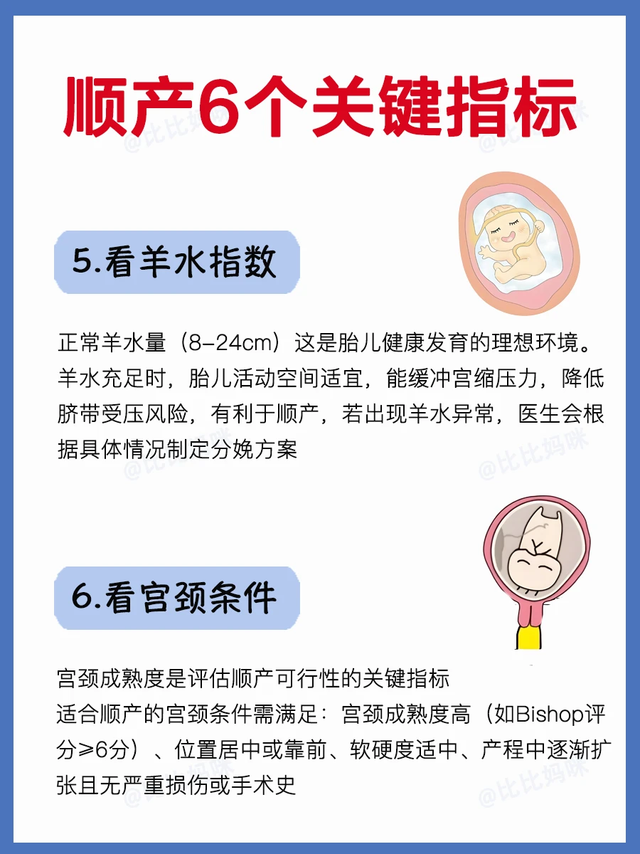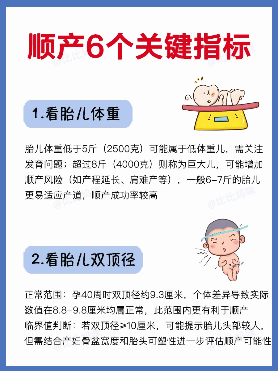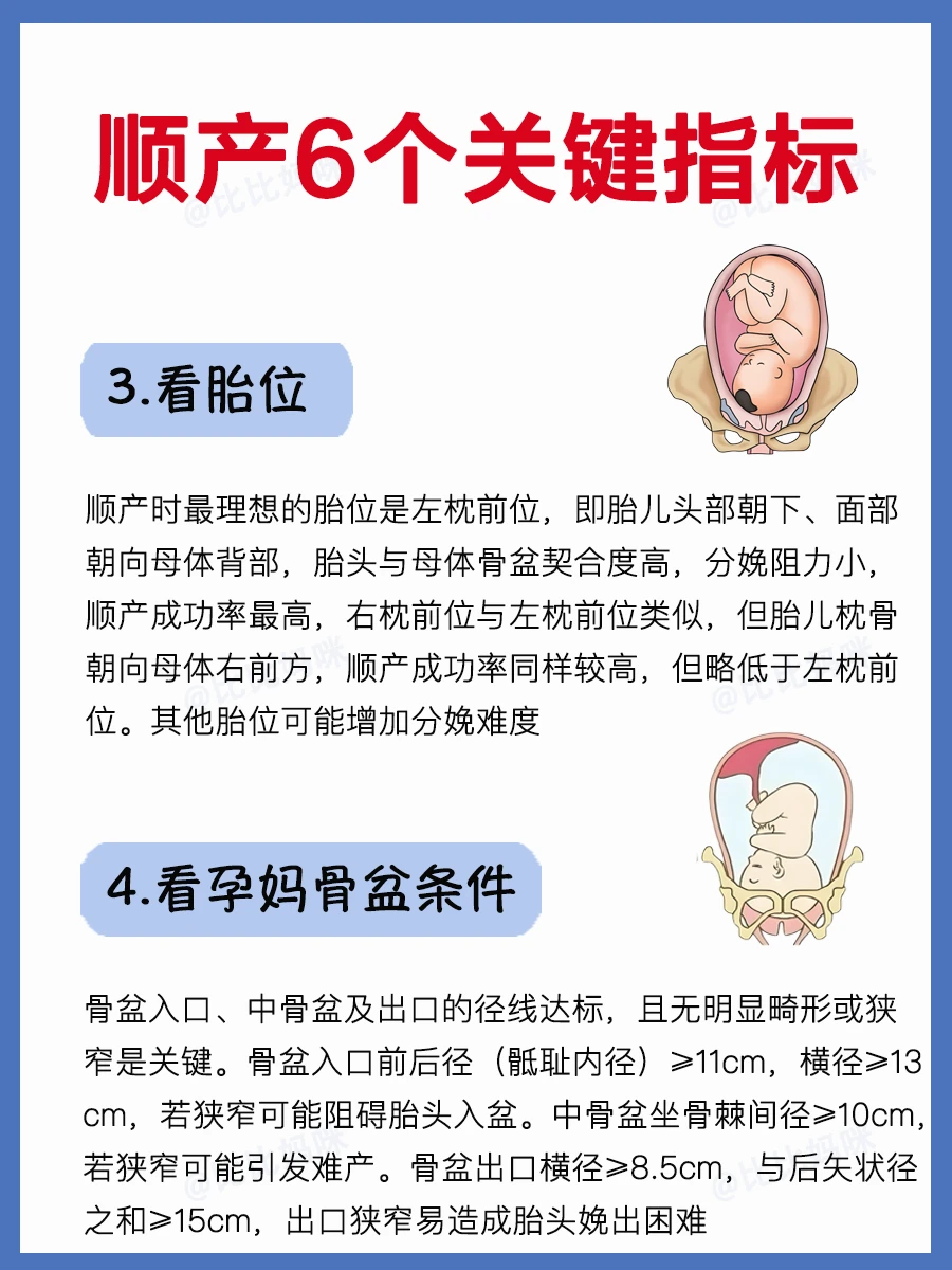 孕晚期的姐妹们,如果你打算顺产 先看看是否满足这6个顺产关键指标 · ⭕️本文内容包括: 1⃣️看胎儿体重 2⃣️看胎儿胎位 3⃣️看胎儿双顶径 4⃣️看孕妈骨盆条件 5⃣️看孕妈羊水指数 6⃣️看孕妈宫颈条件 · 如果这6个指标都满足,那么恭喜你,可以顺产~ 愿所有打算顺产的孕妈们都超快顺产,一切顺利~