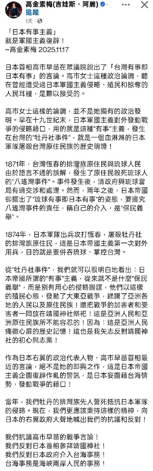高市早苗的发言,是军国主义对台湾牡丹社事件的重演。 对于日本人,有着高山族血统的高金素梅从来没有给过好脸色。 作为台湾的原住民,日本人的嘴脸,她很清楚,在眼中,这次的“没事找事”言论,纯粹是日本的军国主义再现。 150年前的牡丹社事件,一开始只是台湾排湾族与琉球民众的小冲突,被日本用“琉球有事就是日本有事”出兵恒春半岛,牡丹社的排湾族原住民被屠杀,日本对外形容此为保民义举。 那时候的琉球还不叫冲绳,是琉球王国,与日本一点直接关系都没有。 琉球和台湾,都与日本没有关系