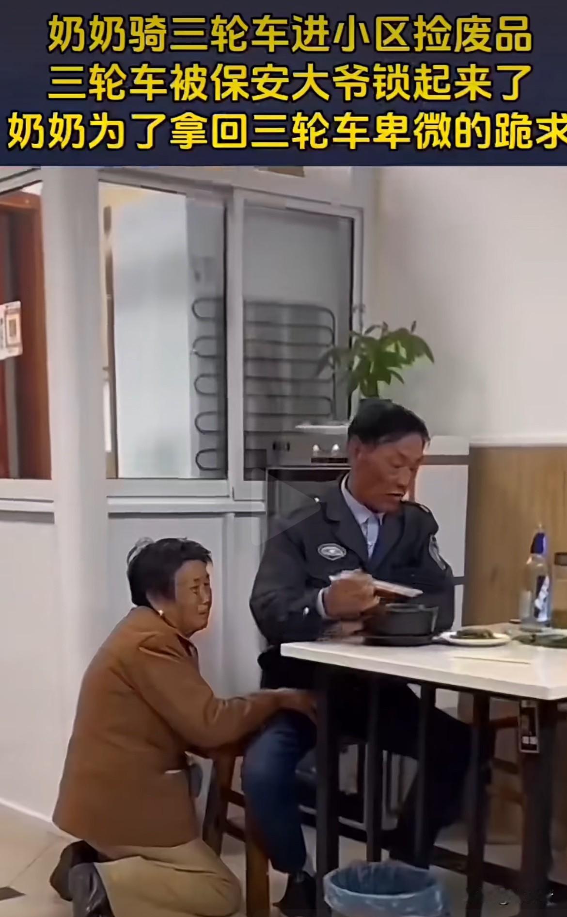 老奶奶骑三轮车进小区捡废品,居然三轮车被保安大爷锁起来了,最后奶奶为了拿回三轮车卑微的跪求,保安大爷就是不肯放行,谁都不容易。