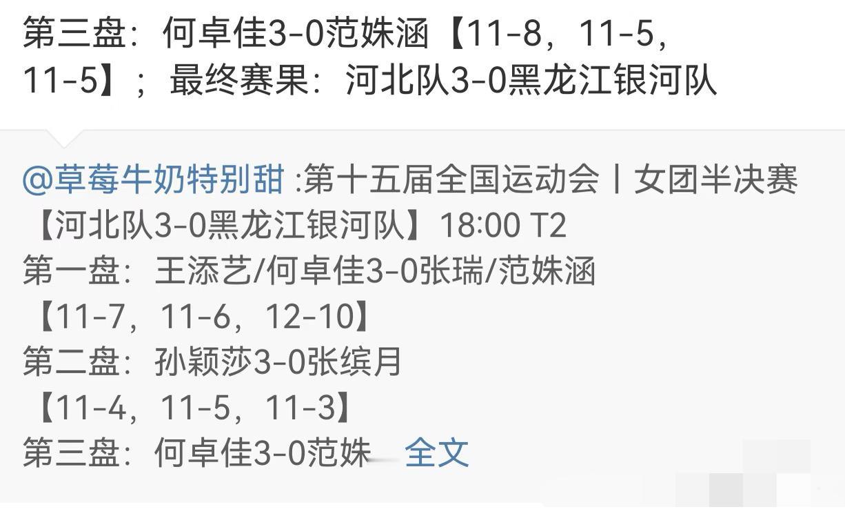 全运会乒乓球河北女团时隔24年晋级决赛——孙颖莎笑的开心 11月18日,全运会女团半决赛, 河北3:0黑龙江 第一盘何卓佳/王添艺3:0张瑞/范姝涵 第二盘,孙颖莎3:0张缤月 第三盘 何卓佳3:0范姝涵 恭喜河北女团时隔24年晋级决赛, 河北的女孩们都很棒, 有人给凑分的感觉真的很好👍, 赛前谁敢想啊, 辽宁队是是届冠军, 爆冷输给河北队, 黑龙江队的王曼昱上午肩部 受伤,不然还会争一争! 恭喜河北队, 估计河北夺冠的可能性比较大!