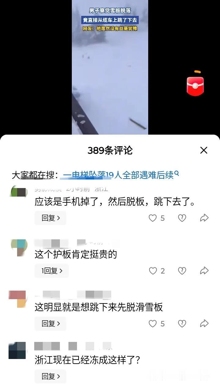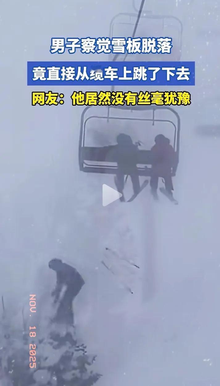 这男子是不是有什么想不开的 竟然做出这样的事儿 滑板掉下去,值得人也跳下去吗?命不要了? 11月17日发生在浙江,只见缆车上坐了三个人,最右手边,这个人的滑板不知道是自己掉下去的?还是他脱掉的? 最关键他做了不可思议的事情,毫不犹豫,直接跳下去了。 从视频中看,我有两个猜测: 第一个,他觉得这个地方是安全的,有雪堆,有树,能接着他,他预判是安全,所以他才跳。 第二,掉下去不单是滑板,而是手机掉下去了,所以他才跳的。要知道手机里面有很多东西呢? 大家讨论一下吧!