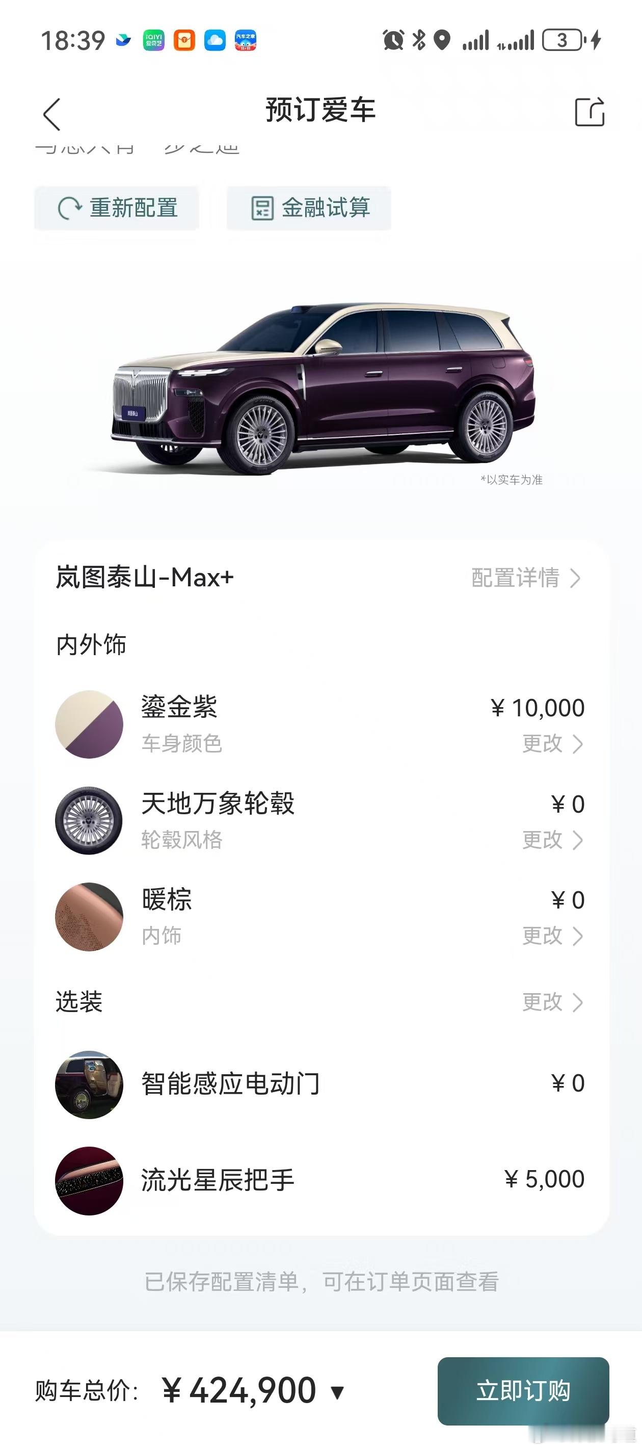 现场下定锁单!入手一辆武汉库里南!最喜欢泰山的双拼鎏金紫色,还有水晶把手,为此额外多付1.5万元。只等尽快提车了!等车评哈!