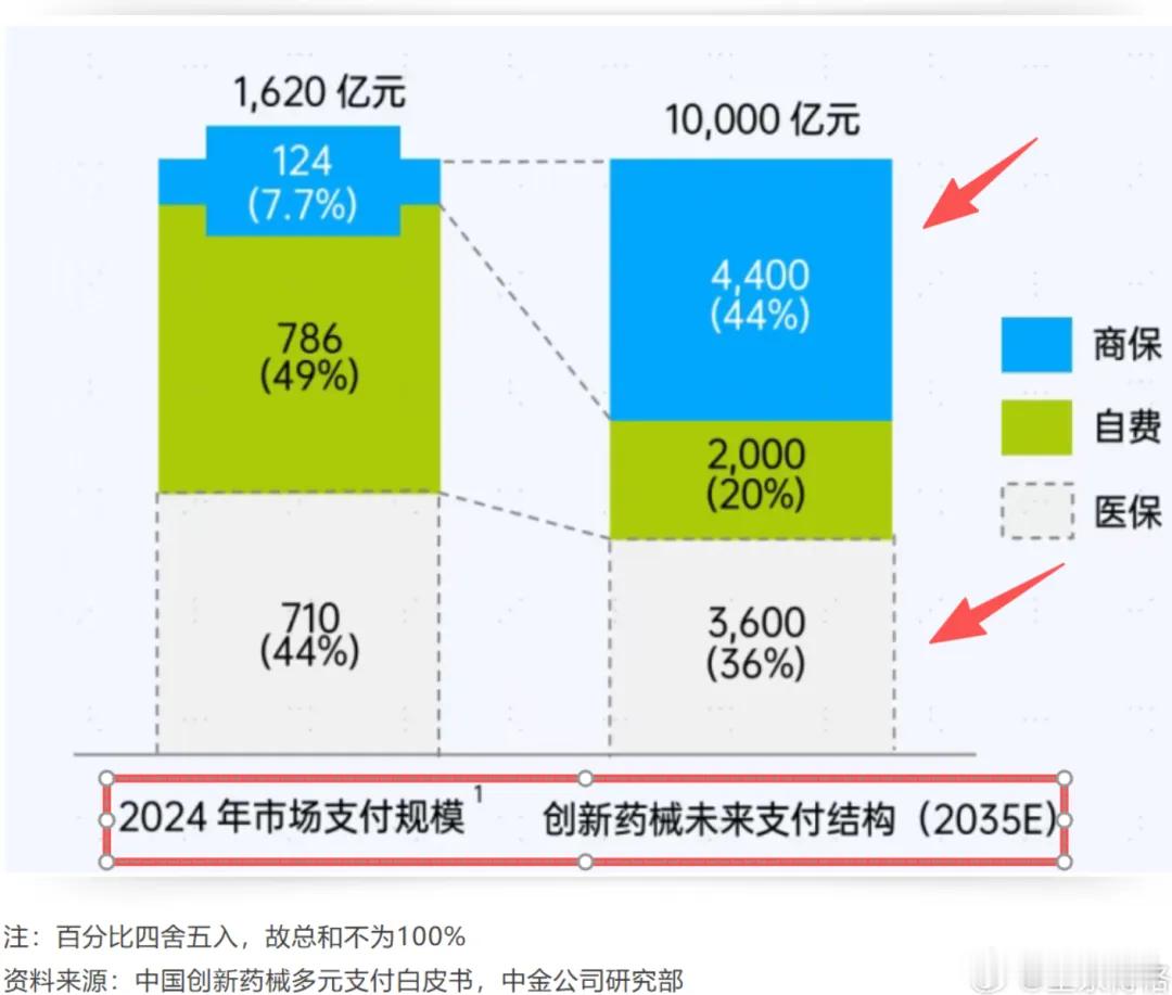 今天看中金研报里面的一张图也非常有意义:2024年国内创新药支付规模为1620亿,预计到2035年这个规模将达到10000亿,说明创新药未来空间很大。接着谁来给创新药买单呢?2024年的时候,医保买单710亿(占比44%),自费买单786亿(占比49%),商业保险买单124亿(占比7.7%),关键是自费买创新药的要比医保买创新药的高。2035年的时候,医保预计买单3600亿(占比36%),这个占比相比2024年下降了,大概率因为医保收入增长速度赶不上创新药支出的增长速度。自费预计买单2000亿(占比20%),商业保险买单4400亿(占比44%)。博格只能说,大家对于商业保险的发展有点乐观了,商保不行继续提高自费比例呗。美国之所以是一个创新药消费大国的主要原因之一是其商业保险比较发达。博格也希望国内保险也可以高质量发展,继续少点销售提成,多点保费支出。出于对创新药的信仰,今天盘中又发车了医药汉堡。