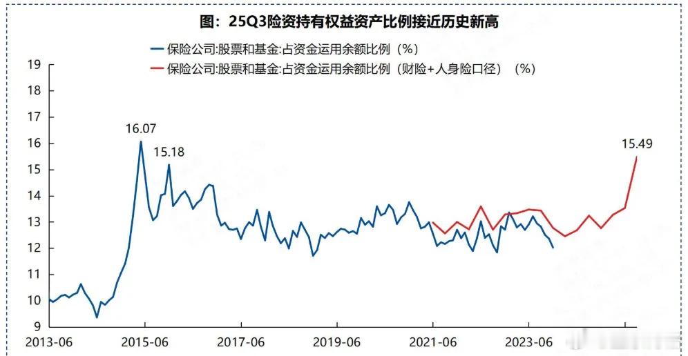 今天看了兴业证券统计的数据:保险资金持有的股票与基金资产比例接近历史新高。保险公司在2015年6月的时候,持有的股票与基金资产比最高到过16.07%。现在2025年9月,这个比例达到15.49%,也就是接近历史最高点了。这个意思保险公司也没钱加仓了吗?很难得出这个结论。因为保险公司投资股票与基金比例限制跟之前不一样了。2015年的时候,保险公司投资权益类资产比例上限提高到40%;2018年的时候,保险公司投资权益类资产比较上限降低到30%;2025年的时候,保险公司投资权益类资产比例上限提高到50%。所以保险公司是否加仓股票,还要看他们自己的投资决策。另外不得不说,2015年的时候十年期国债利率还在4%左右,现在已经降低到1.8%左右,如果保费持续增加的话,保险公司还会继续买红利股,尤其是港股红利股。