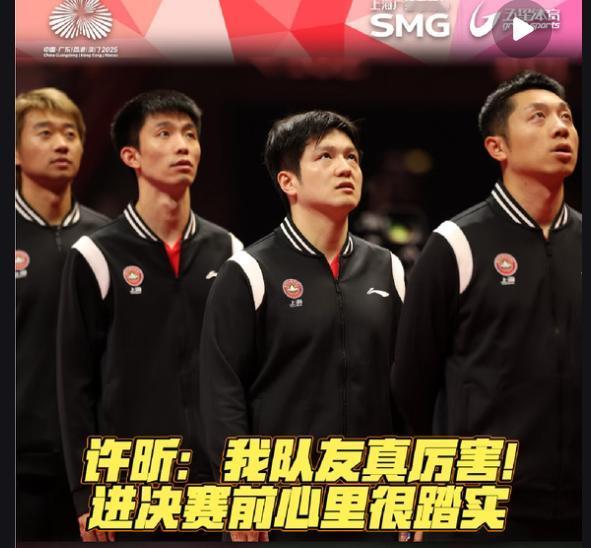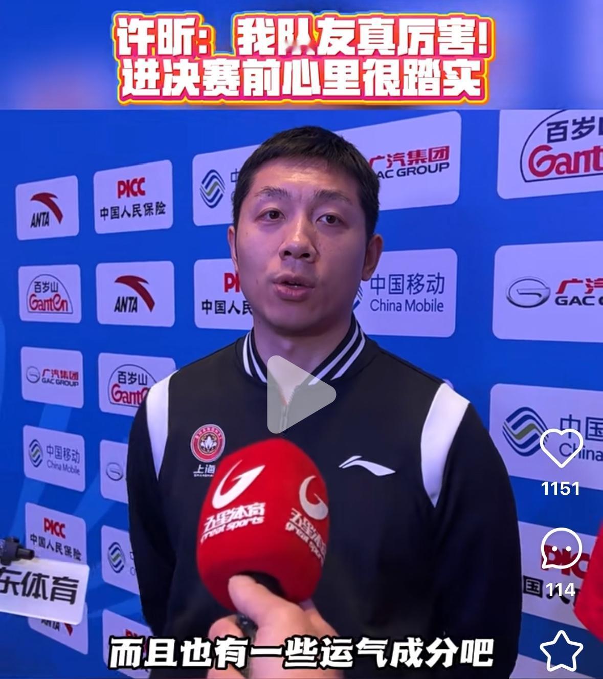 许昕展望明天团体对战北京男团:有樊振东 周恺在挺安心 11月18日,全运会男团半决赛中 上海队3:0黑龙江男团 晋级决赛,对战北京男团! 赛后许昕在采访中表示: “前三年我们也拿下团体冠军, 但我们一直觉得自己不是特别强, 而且也有一些运气成分, 而且上海队比以前更加顽强一些, 特别是有樊振东和周恺的加入, 进入决赛, 我很踏实! 明天晚上男女团体决赛, 河北女团VS山东女团 上海男团VS北京男团, 加油北京 上海! 加油河北 山东!