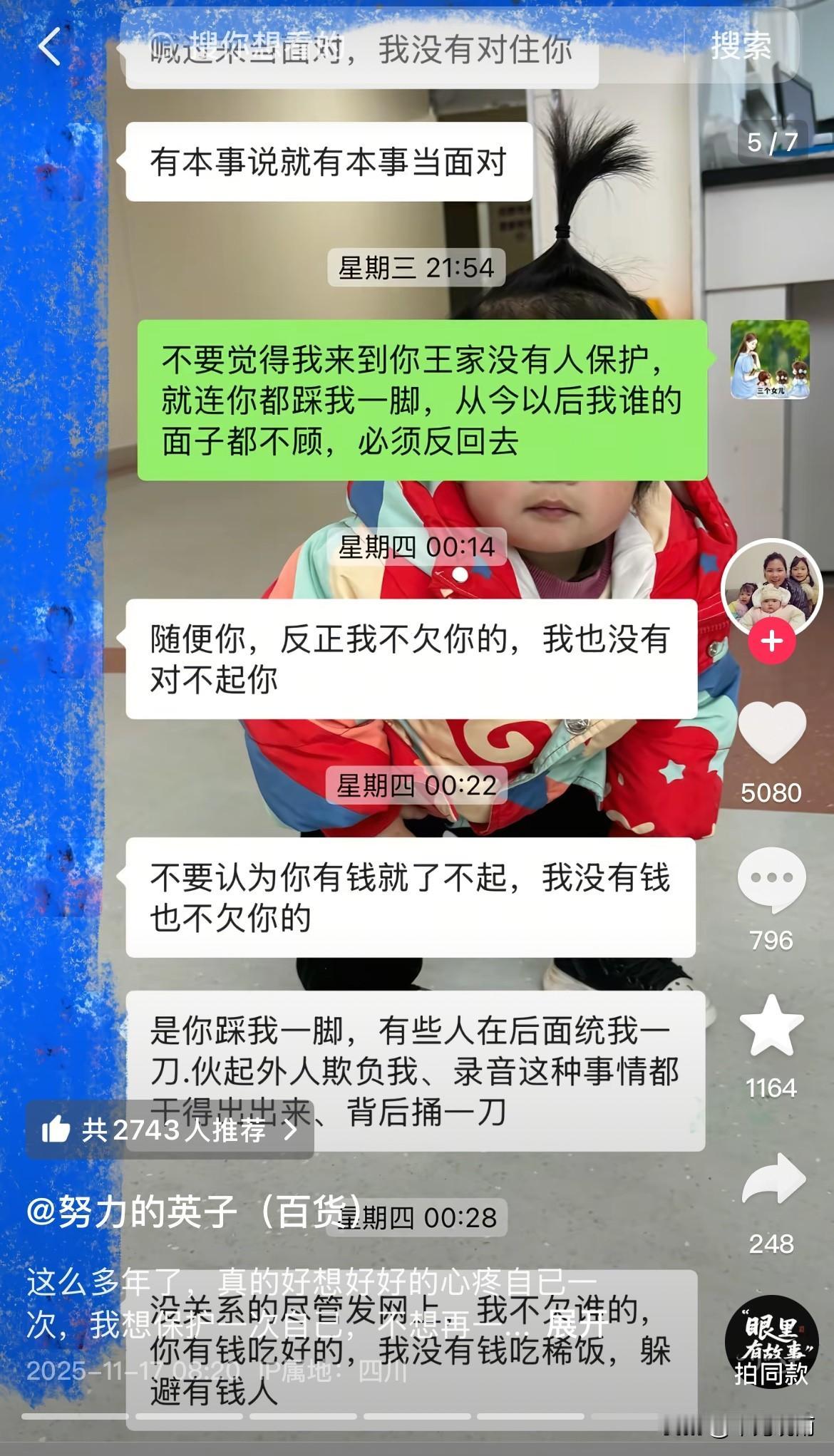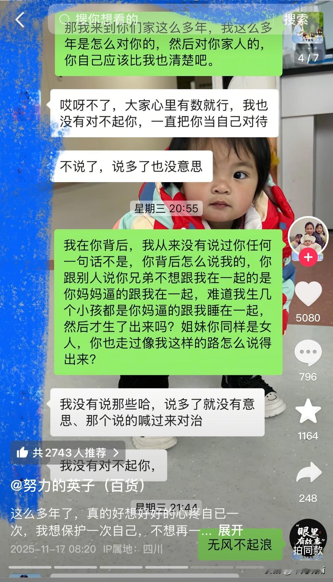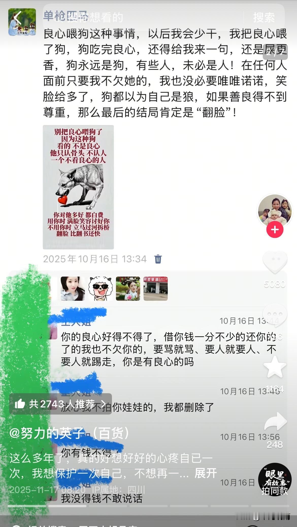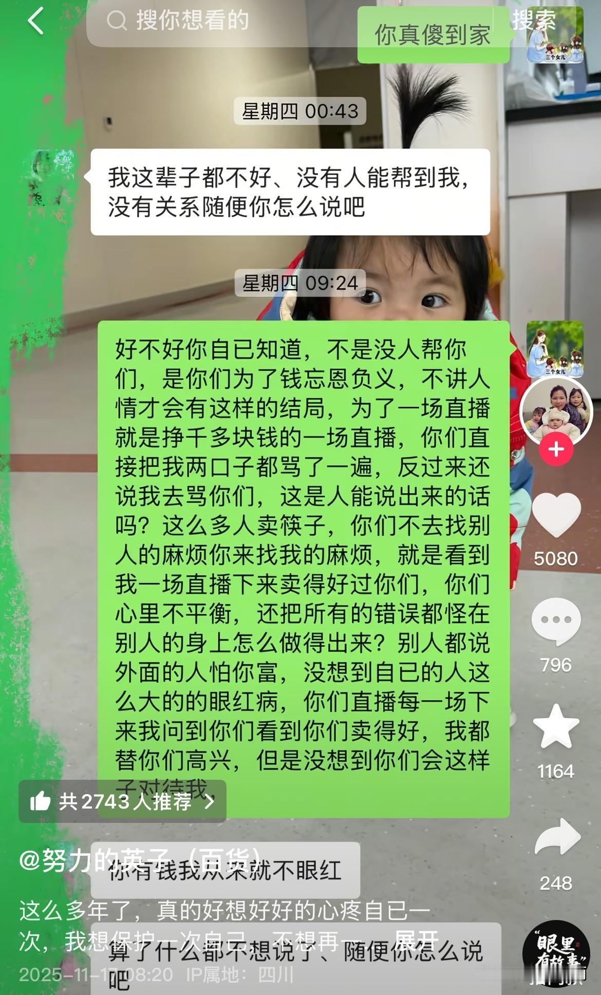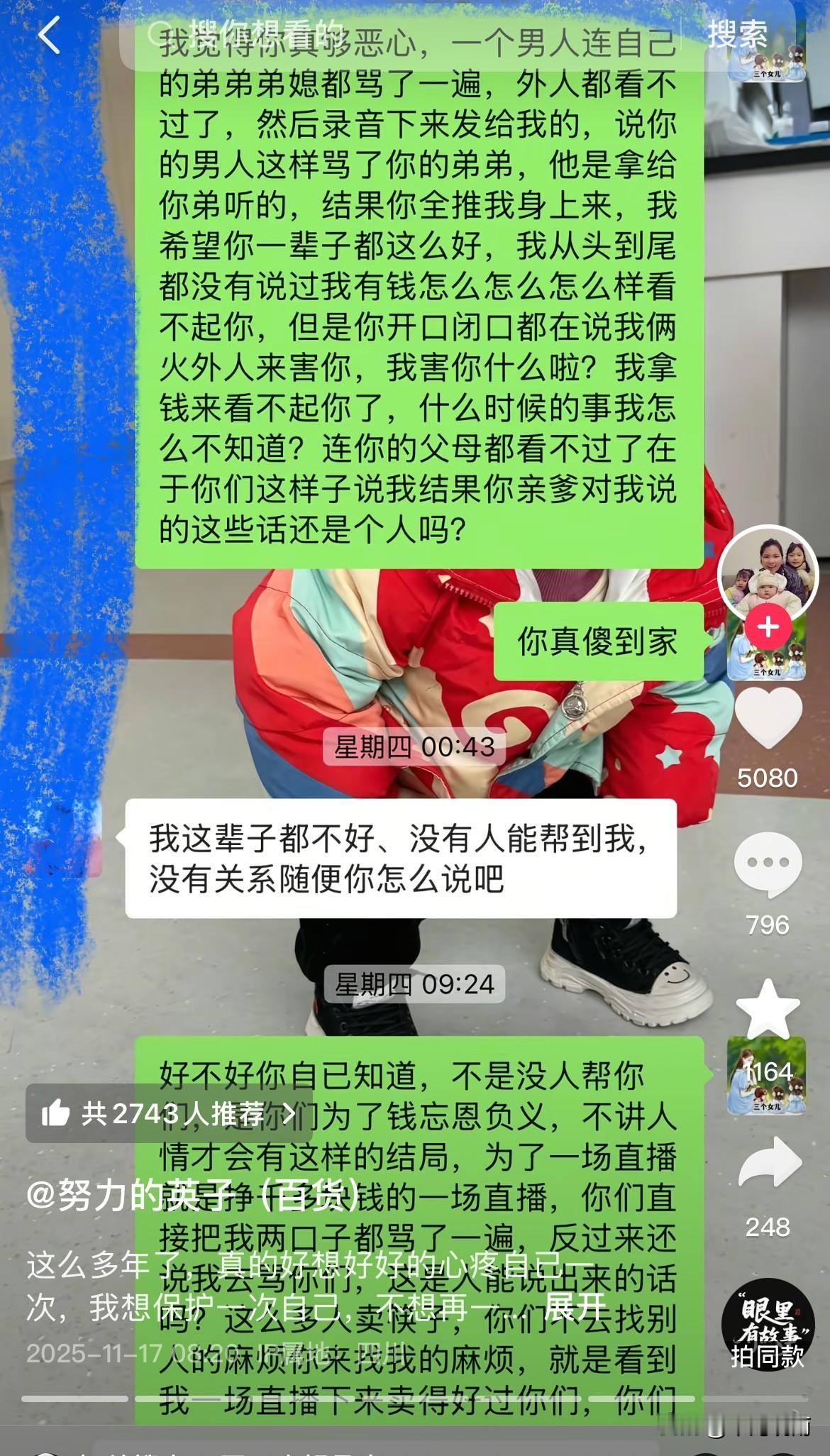 小英子和乡村大姐闹掰了,活生生上演了一出“农夫与蛇”的戏码! 乡村大姐小三上位,狠心抛下两个年幼的孩子,二婚嫁给了同样家境不宽裕的勇哥。 在农哥四哥一家的帮扶下,她踏上了自媒体之路,渐渐脱贫致富。 谁能想到,这乡村大姐竟吃水忘了挖井人。她多次在直播时口无遮拦,声称若不是父母逼迫,自己的兄弟农村四哥早就不会和小英子在一起了。 这话是一个大姑子该说的吗? 面对农村四哥在经济上的援助,乡村大姐理直气壮地表示,借了钱又不是没还! 小英子说得没错,对大姑子的一片好心,全白费了,都喂了狗! 实际上,狗尚且懂得报恩呢! 亲姐弟闹翻,最开心的是谁呢?@农村四哥 @乡村大姐